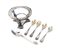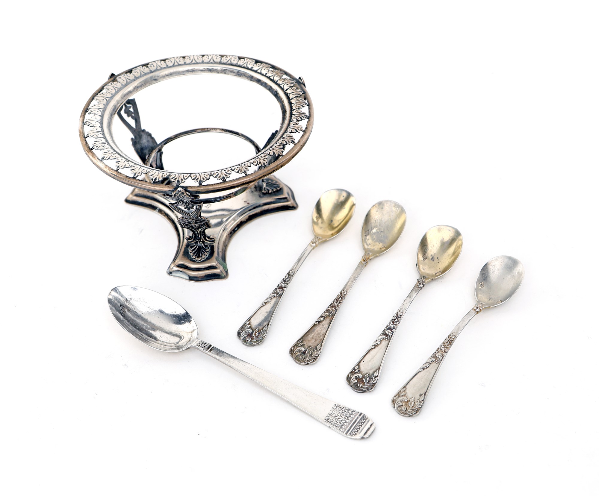 Lotto: sostegno per saliera (vaschetta mancante), quattro cucchiaini da mostarda ed un quinto da caffè, cm 4,5x9 - cm 8 e cm 11 - peso complessivo gr. 90