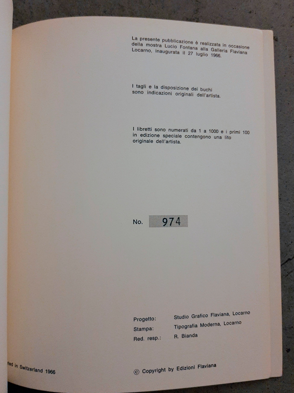 Catalogo monografico con copertina e pagine fustellate con tagli e buchi su indicazione dell'artista, edito in occasione dell'esposizione tenutasi a Locarno, presso la Galleria Flaviana, inaugurata il 27 luglio 1966. Edizione di 1.000 copie numerate, esemplare n. 974