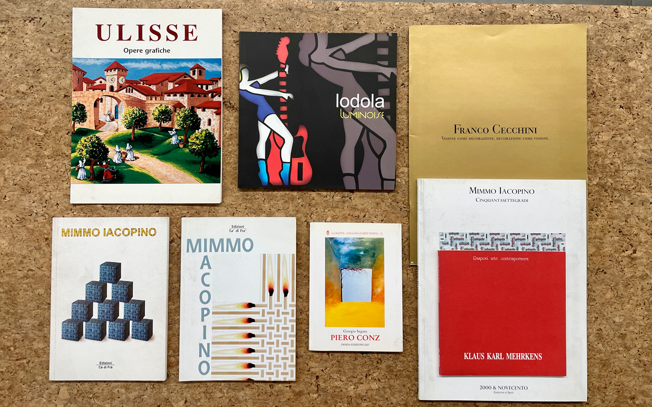 Scatola contenente numerosi cataloghi relativi ad esposizioni personali e collettive dei seguenti artisti: Luca Matti, Emanele Gregolin, Francesca Galliani, Gadioli, Enzo Gagliardino, Ferdinando Greco, Antonio Gambadoro, Mark Wright, Elio Ciol, Franco Cecchini, Piero Conz, Klaus Karl Mehrkens, Mimmo Iacopino, Ulisse, Marco Lodola