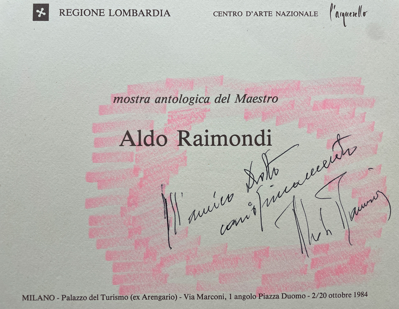 - Aldo Raimondi. Mostra antologica del Maestro Aldo raimondi. Palazzo del Turismo, Milano, 1984 (Reca dedica ad personam all'interno)