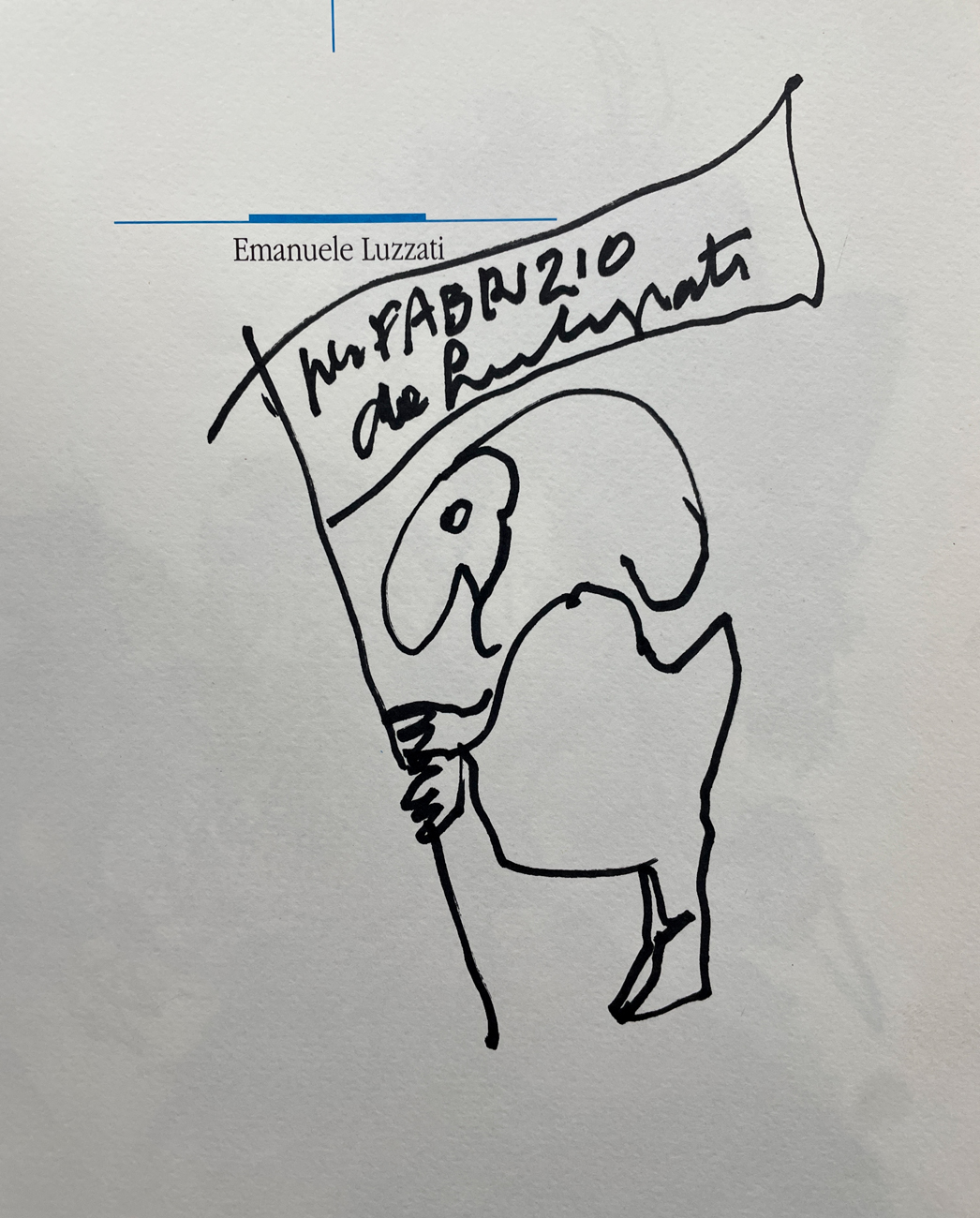 Si allega il catalogo: 'Emanuele Luzzati. 80 opere, disegni, collages sul tema del teatro e della letteratura', 2000 (esposizione tenutasi presso Scuderie di Villa Manzoni, Lecco. Il catalogo reca un disegno a pennarello nero recante firma e dedica dell'Artista all'interno)