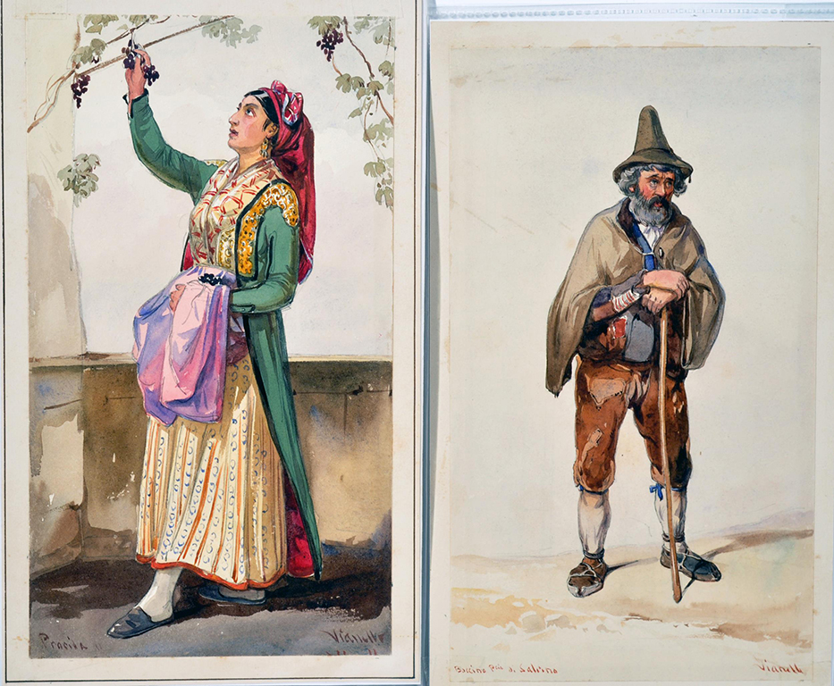 Vianelli Achille (Porto Maurizio, IM 1803 - Benevento 1894) a) Procidana acquerello su carta, cm 23,5x13,3 firmato in basso a destra: Vianelli iscritto in basso a sinistra: Procida b) Personaggio di Buccino acquerello su carta, cm 23,5x13 firmato in basso a destra: Vianelli , iscritto in basso a sinistra: Buccino prov. di Salerno