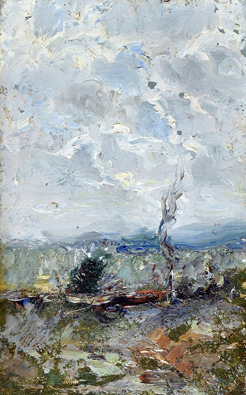 Pratella Attilio (Lugo di Romagna, RA 1856 - Napoli 1949) Paesaggio olio su tela, cm 15,7x9,7 non firmato