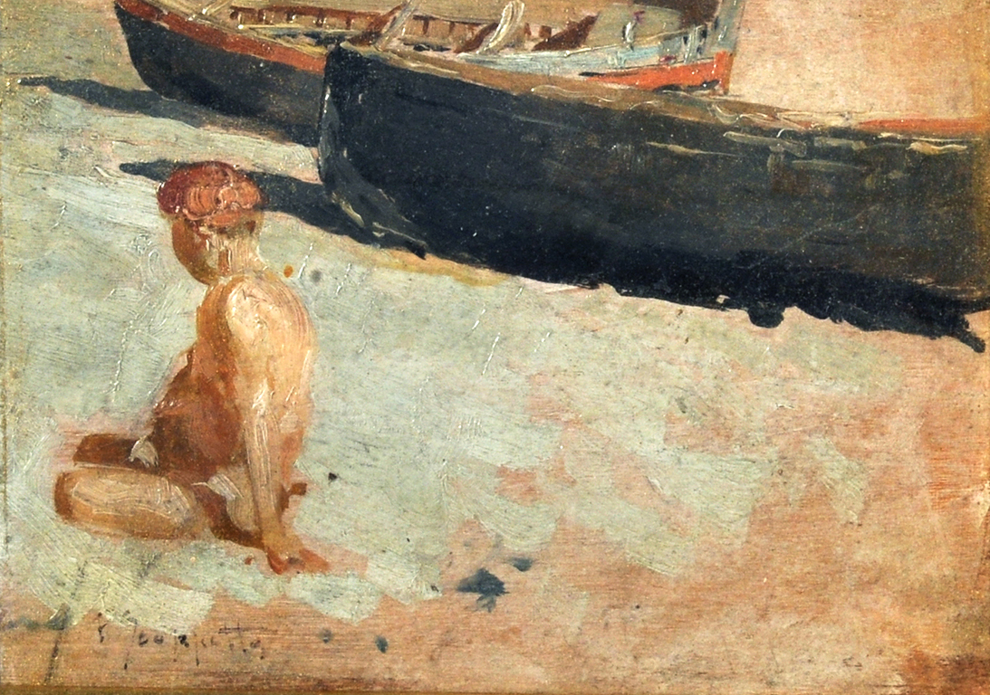 Scoppetta Pietro (Amalfi, SA 1863 - Napoli 1920) Arenile olio su tavola, cm 10x14 firmato in basso a sinistra: P. Scoppetta