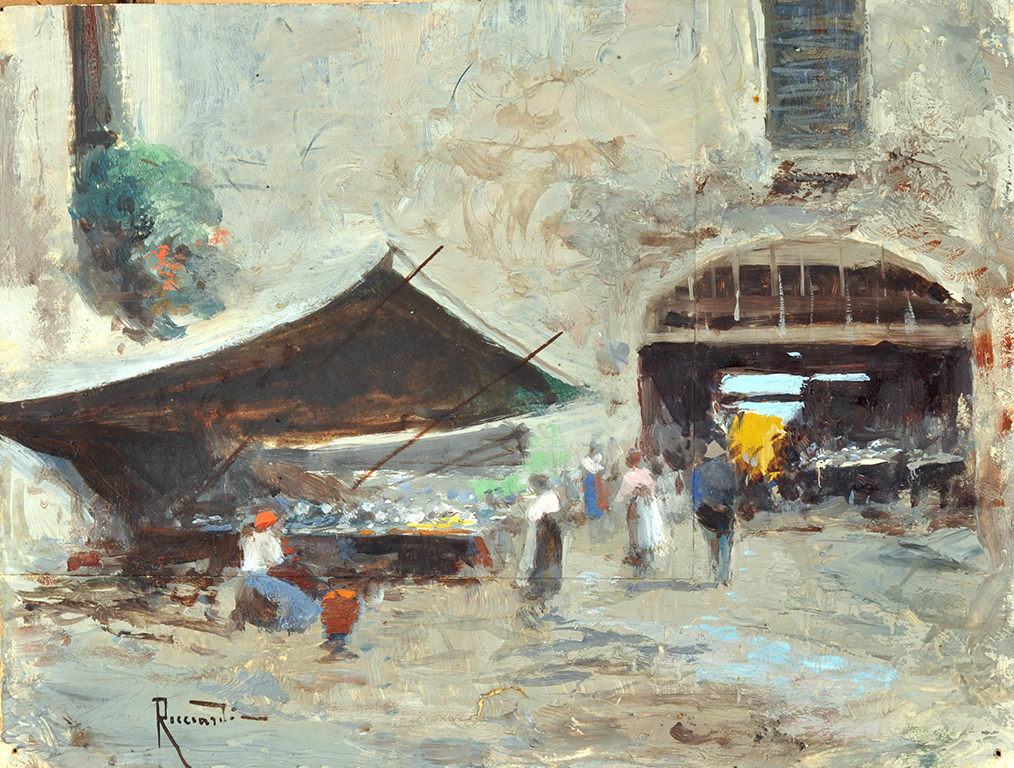 Ricciardi Oscar (Napoli 1864 - 1935) Mercato olio su cartone, cm 13x17,2 firmato in basso a sinistra: Ricciardi