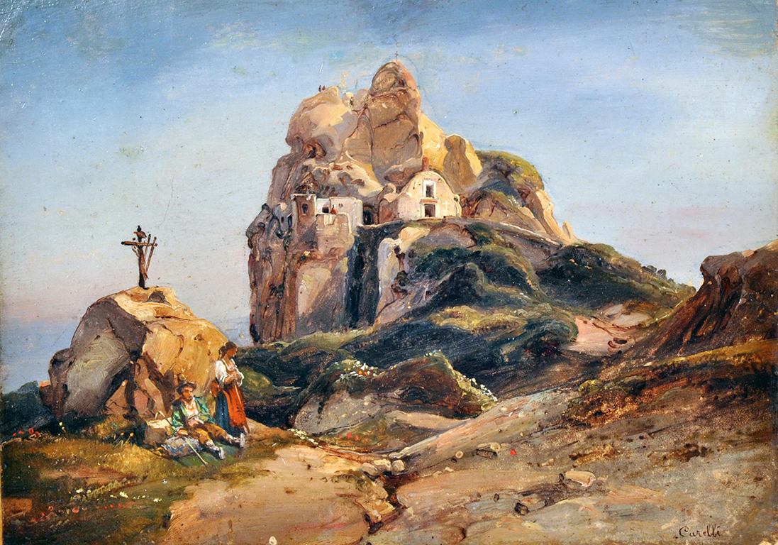 Carelli Gonsalvo (Napoli 1818 - 1900) Veduta della Chiesa di San. Nicola Epomeo olio su carta rip. su cartoncino, cm 19,5x27,5 firmato in basso a destra: Carelli