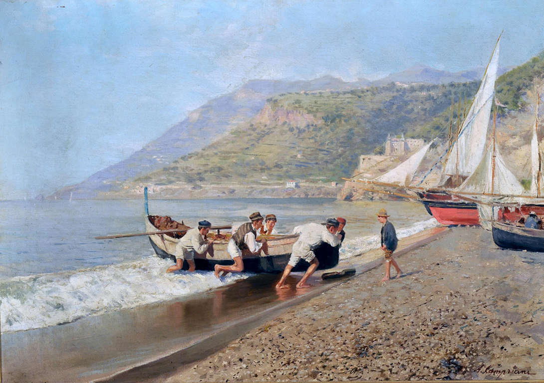 Campriani Alceste (Terni, PG 1848 - Lucca 1933) Pescatori sulla spiaggia di Maiori olio su tela, cm 69x48 firmato in basso a destra: A. Campriani