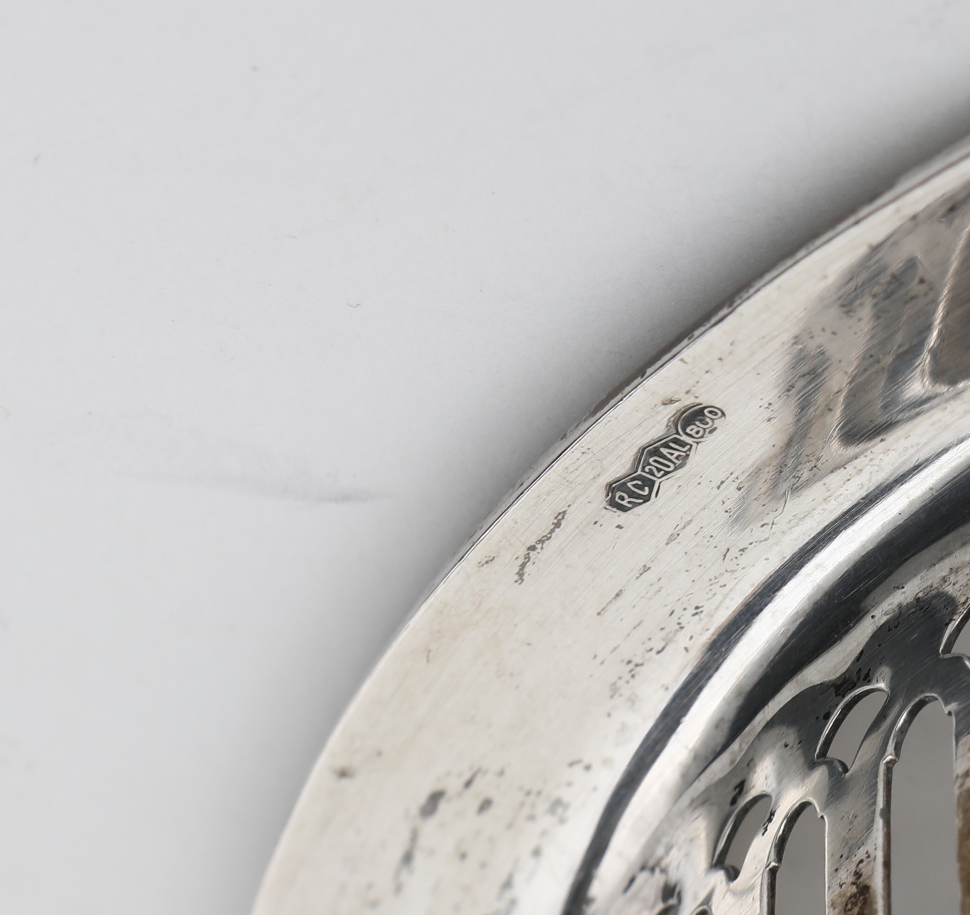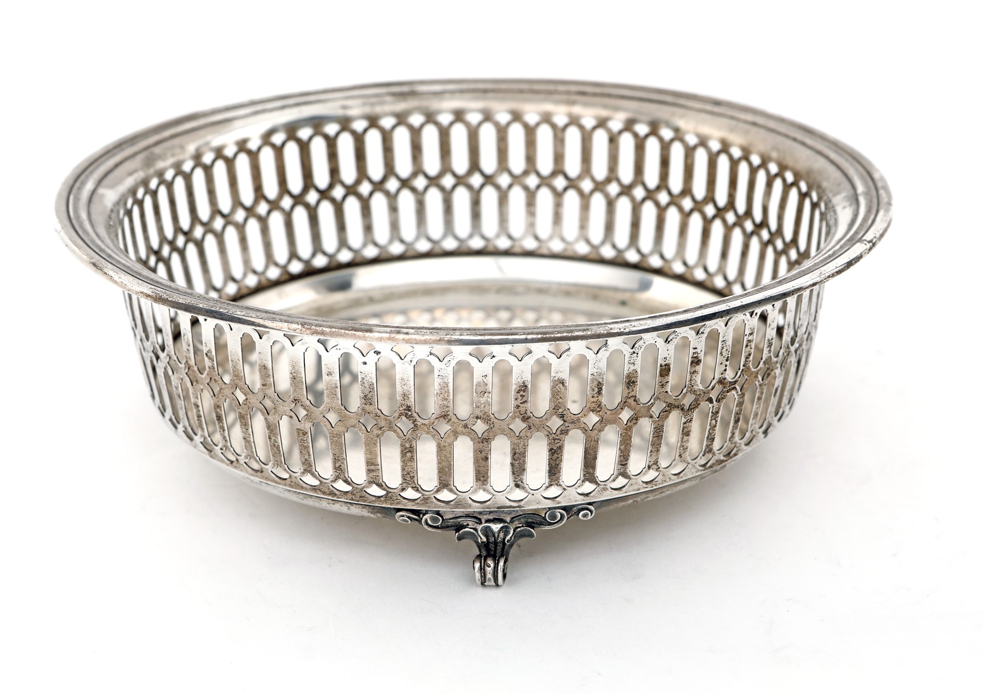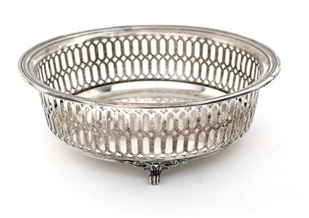 Cestino in argento di forma circolare con ringhiera traforata su tre piedi a ricciolo, cm 7x20 - gr. 272