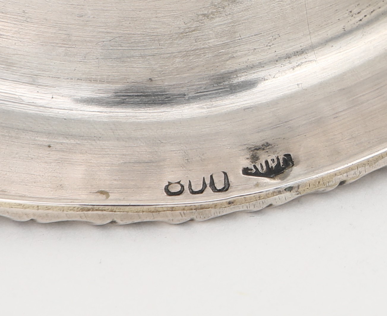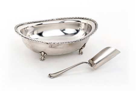 Zuccheriera ovale con paletta profilo cordonato; cucchiaio non pertinente, cm 4,5x13x10 e cm 10,8 - gr. 90