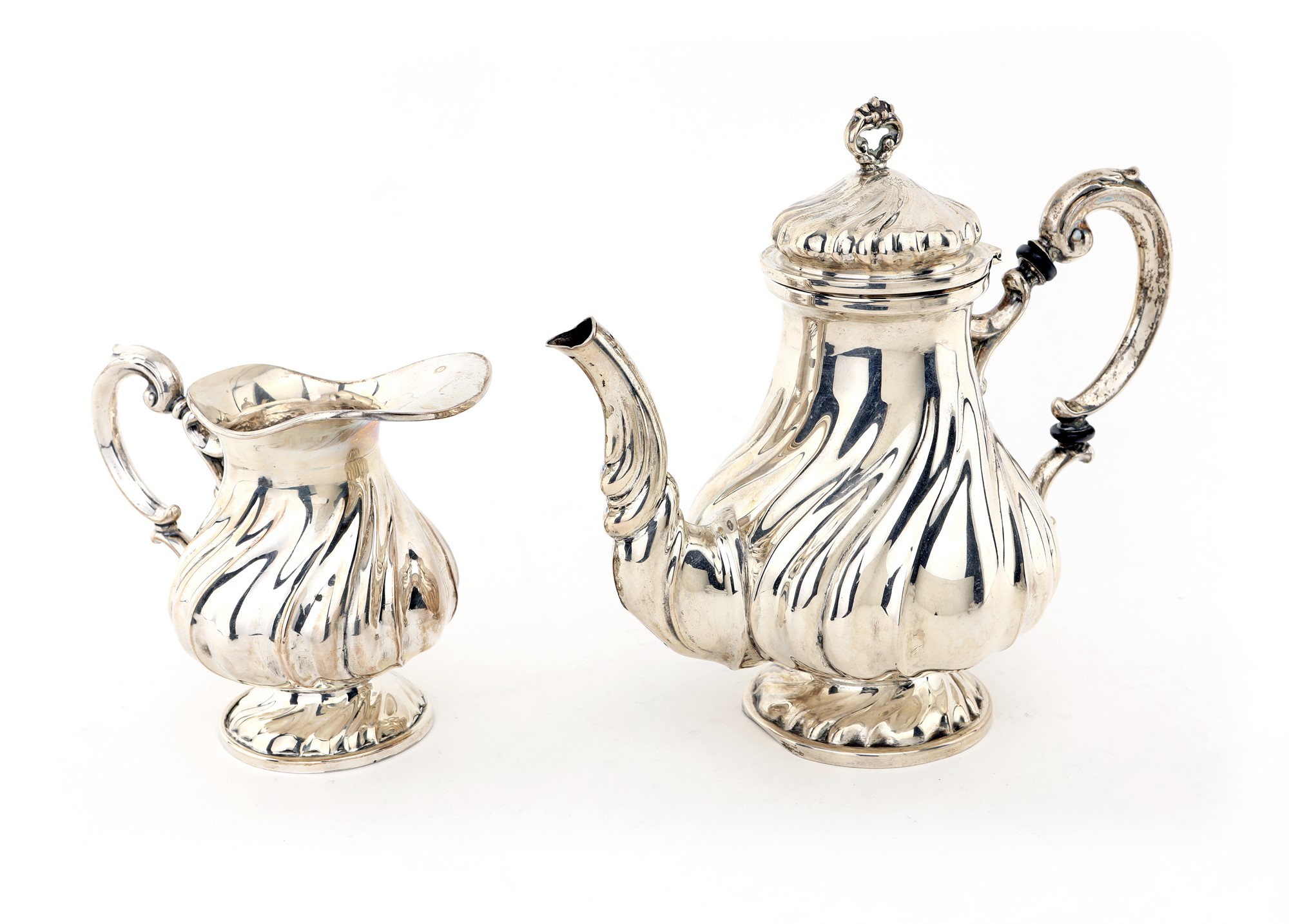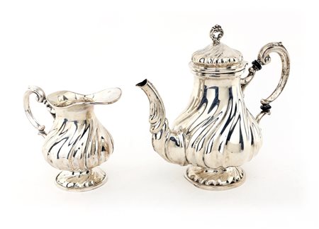 Teiera e lattiera lavorazione a torchon, con versatoio e manico sagomati con interruttore di calore, coperchio incernierato sormontato da presa ad anello. Lievi ammaccature, altezza cm 20 e cm 12 - peso complessivo gr. 490