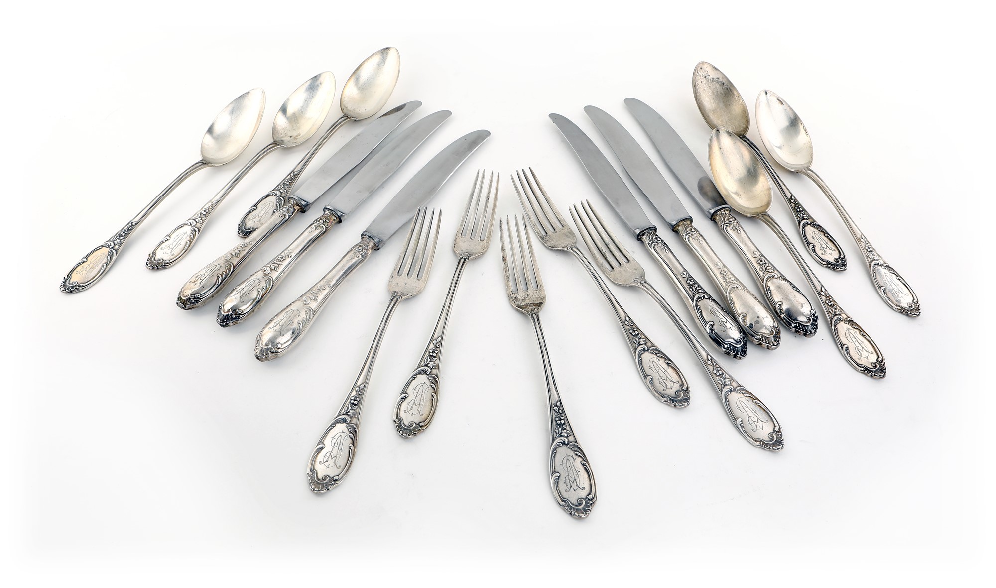 Servizio di posate da pasto incompleto, argentiere Frugoni Roma, Arthur Krupp, Milano composto da sei cucchiai, cinque forchette e sei coltelli con iniziali A.P. incise, gr. 730