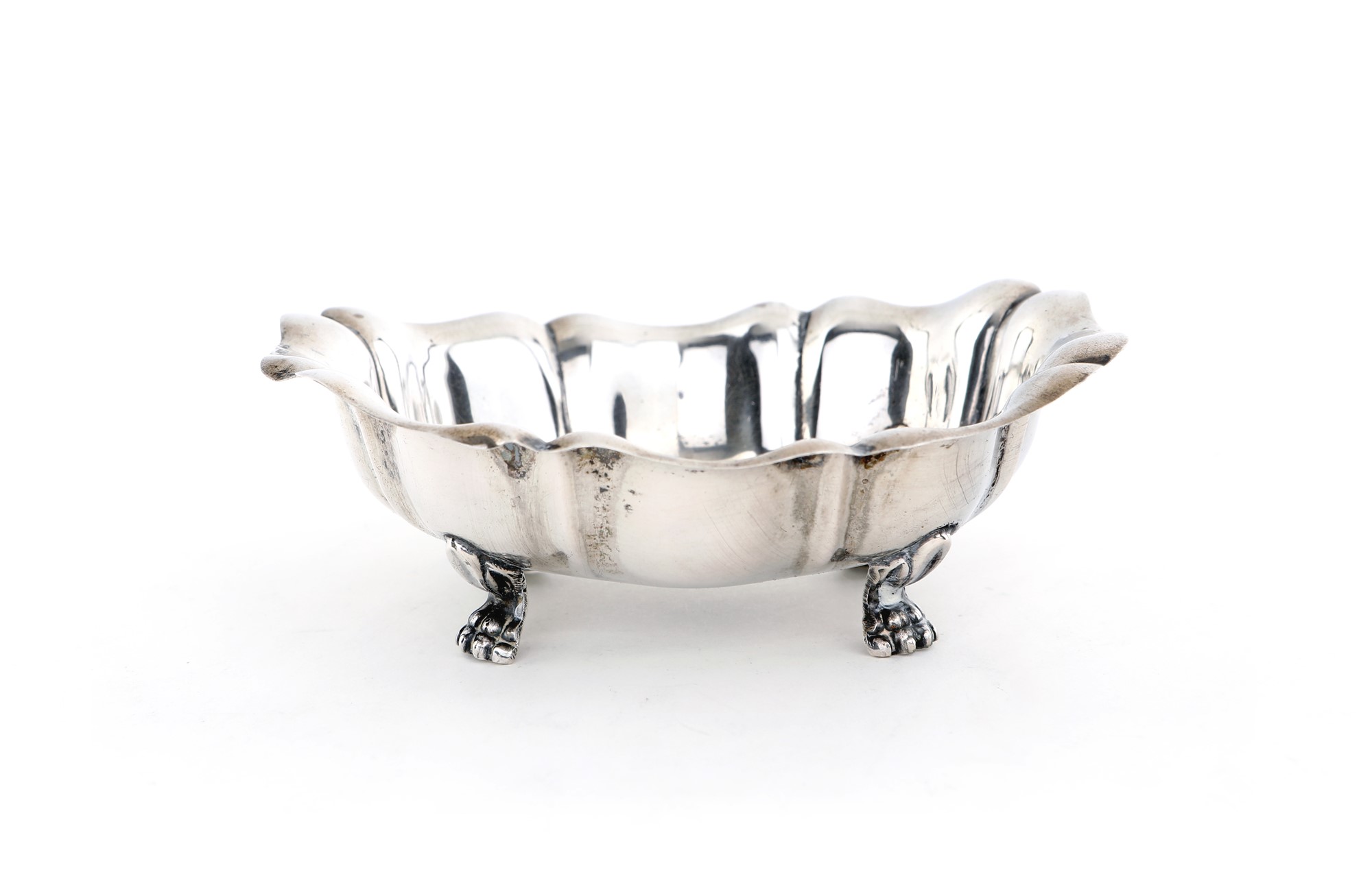 Vaschetta ovale sagomata con profilo incurvato, sorretta da quattro piedi ferini, cm 4x11x9 - gr. 50