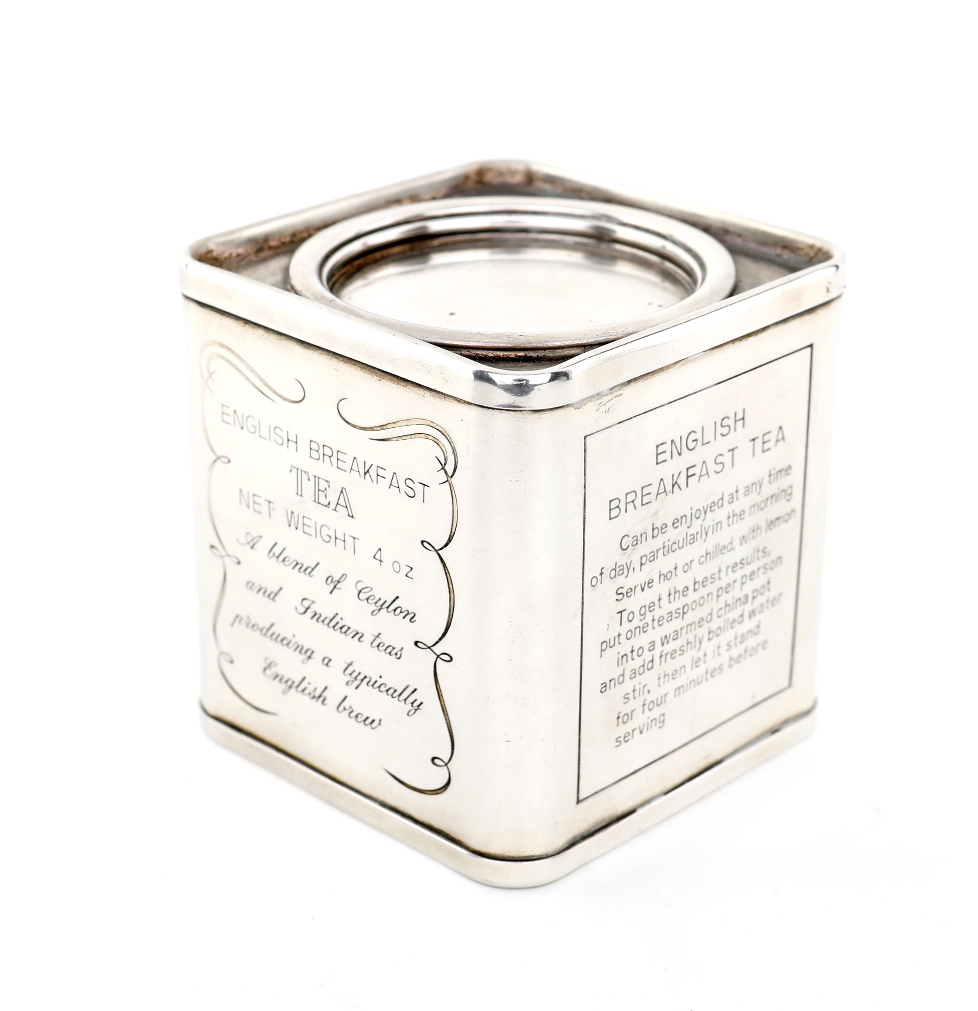 Tea caddy in argento dalla caratteristica forma squadrata con tappo circolare ad incastro e iscrizioni incise su ogni lato, cm 8,5x8x8 - gr. 270 lordi