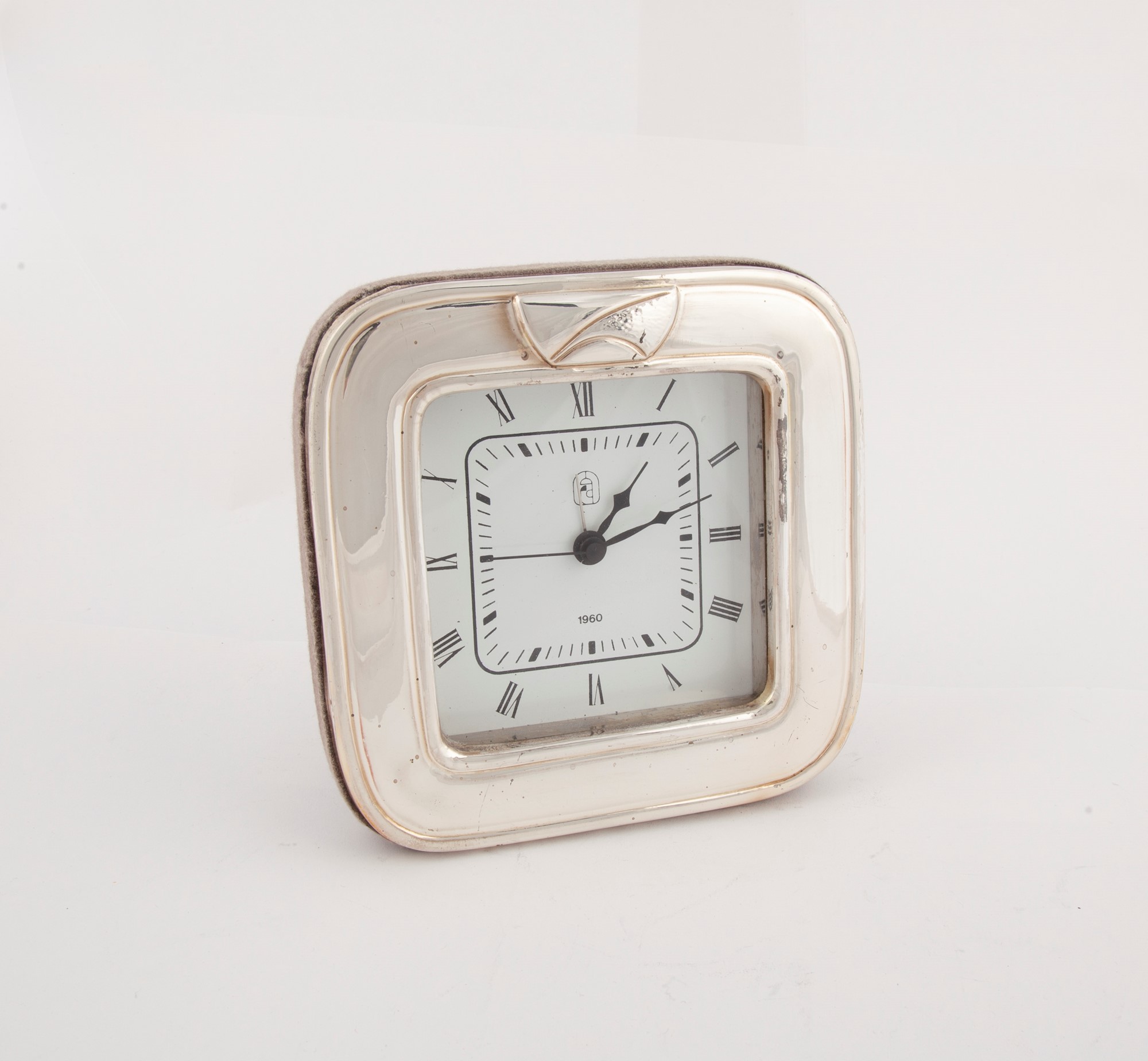 Sveglia da tavolo rivestito in lamina d'argento 800, Anni Sessanta con cornice quadrangolare caratterizzata sul profilo superiore da un motivo a vela stilizzato; quadrante con indicazione oraria a numeri romani, cm 15x15