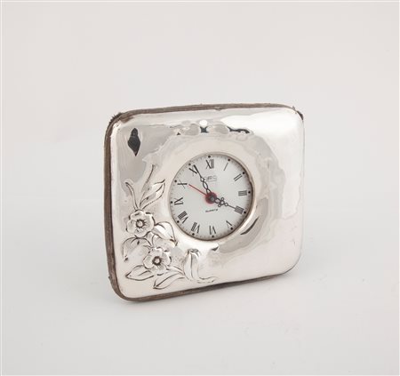 Sveglia al quarzo rivestito in lamina d'argento caratterizzato da un tralcio angolare con fiori sbalzati; fascia oraria a numeri romani, cm 12x13