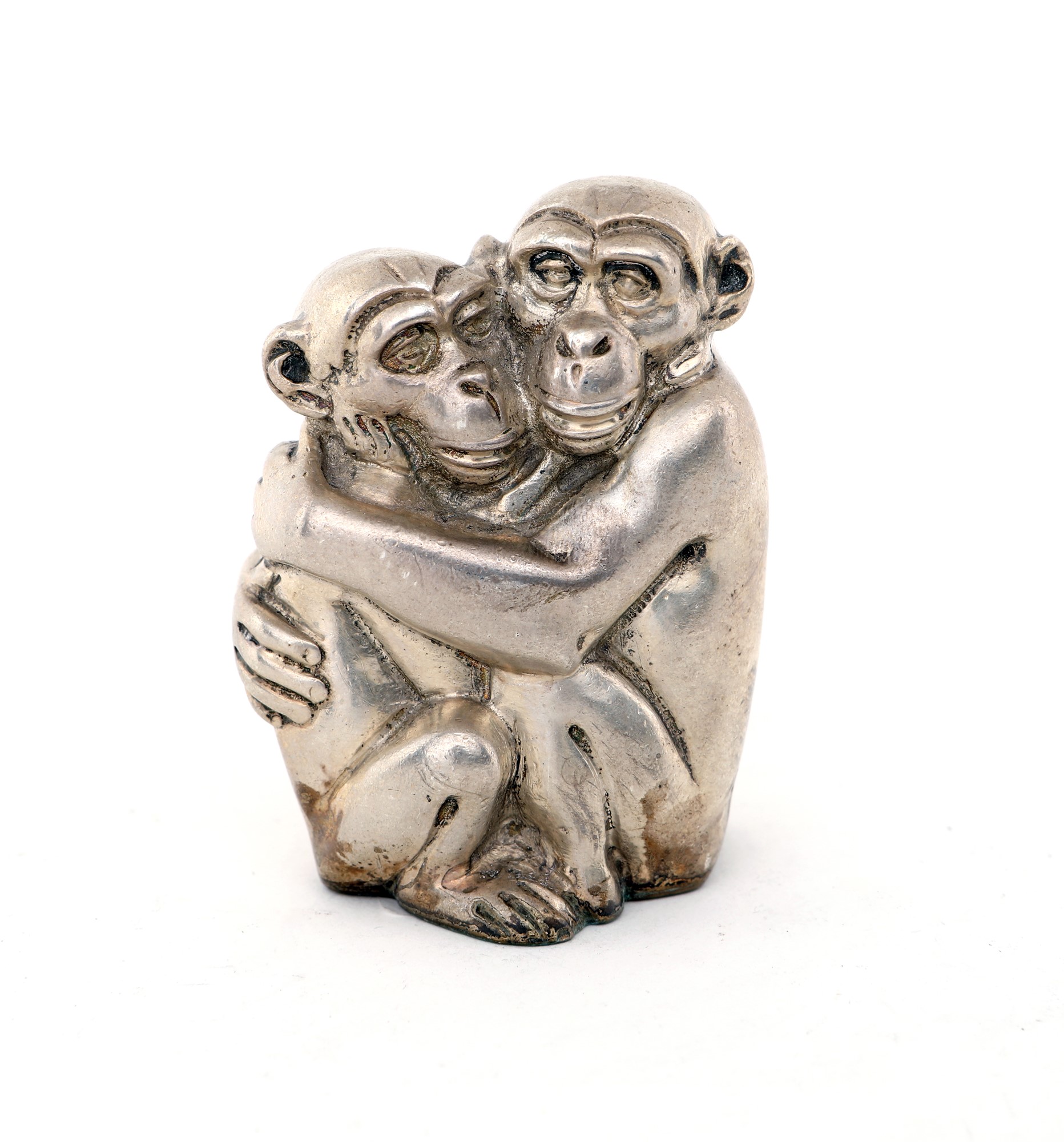 Scultura in argento 800 raffigurante due scimmie abbracciate, cm 6x4,5x3 - gr. 186