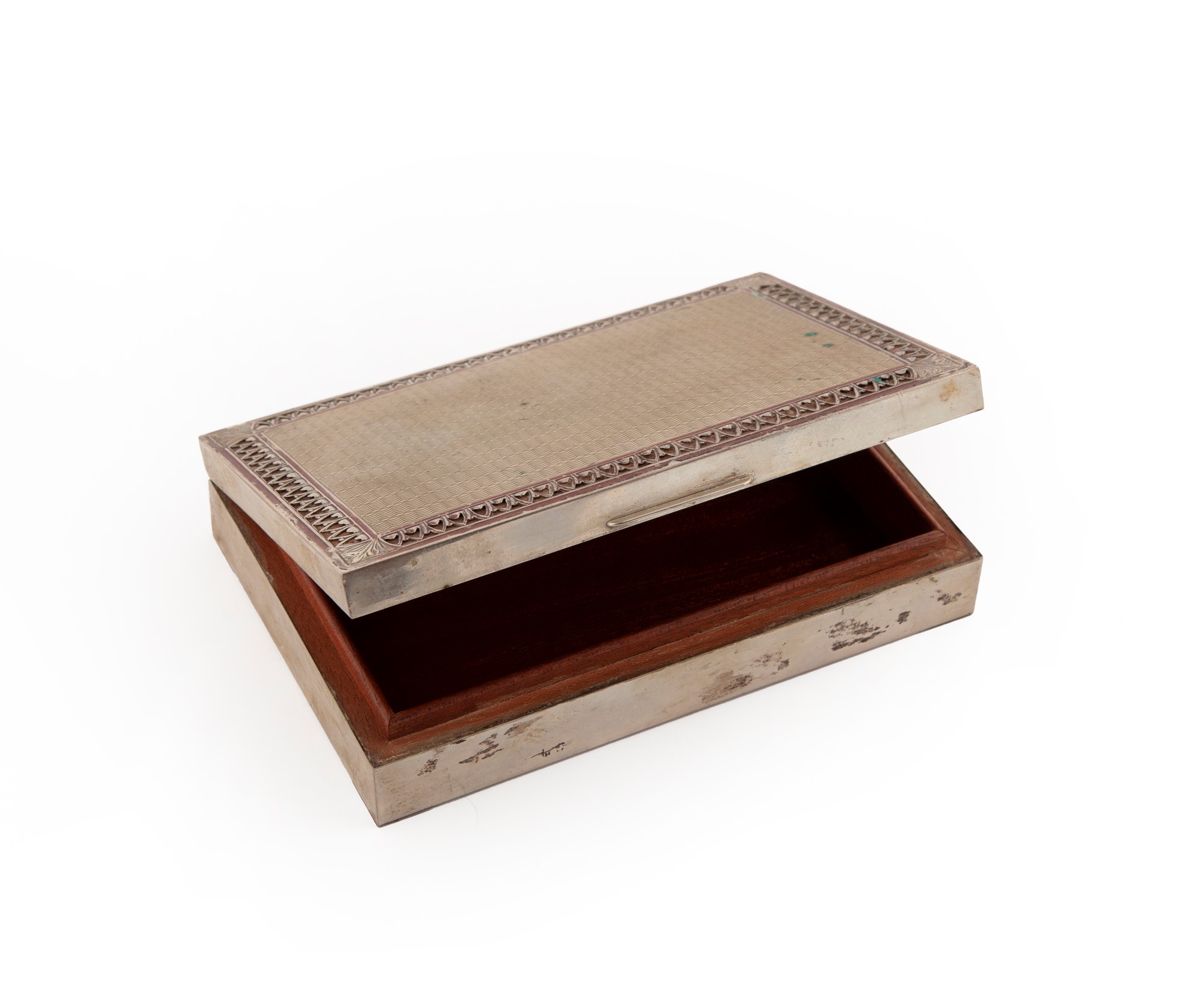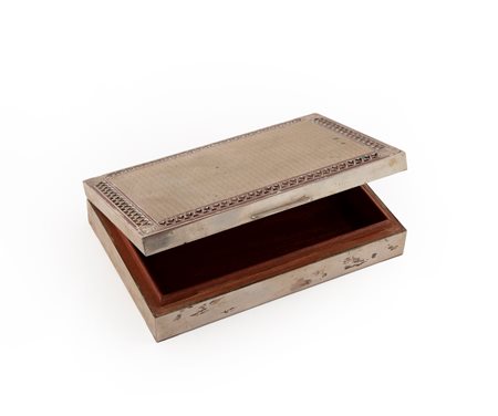 Scatola rettangolare in legno rivestito in argento con coperchio incernierato zigrinato racchiuso da cornice ad archetti ogivali traforati, cm 3x15x10