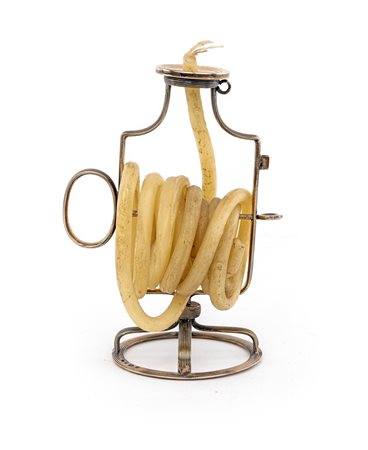 Stoppiniera in argento, Birmingham 1900 con struttura rigata; completa di lungo stoppino arrotolato rivestito in cera; mancante lo spegni moccolo, cm 12,5x9,5x7 - peso complessivo lordo gr. 140