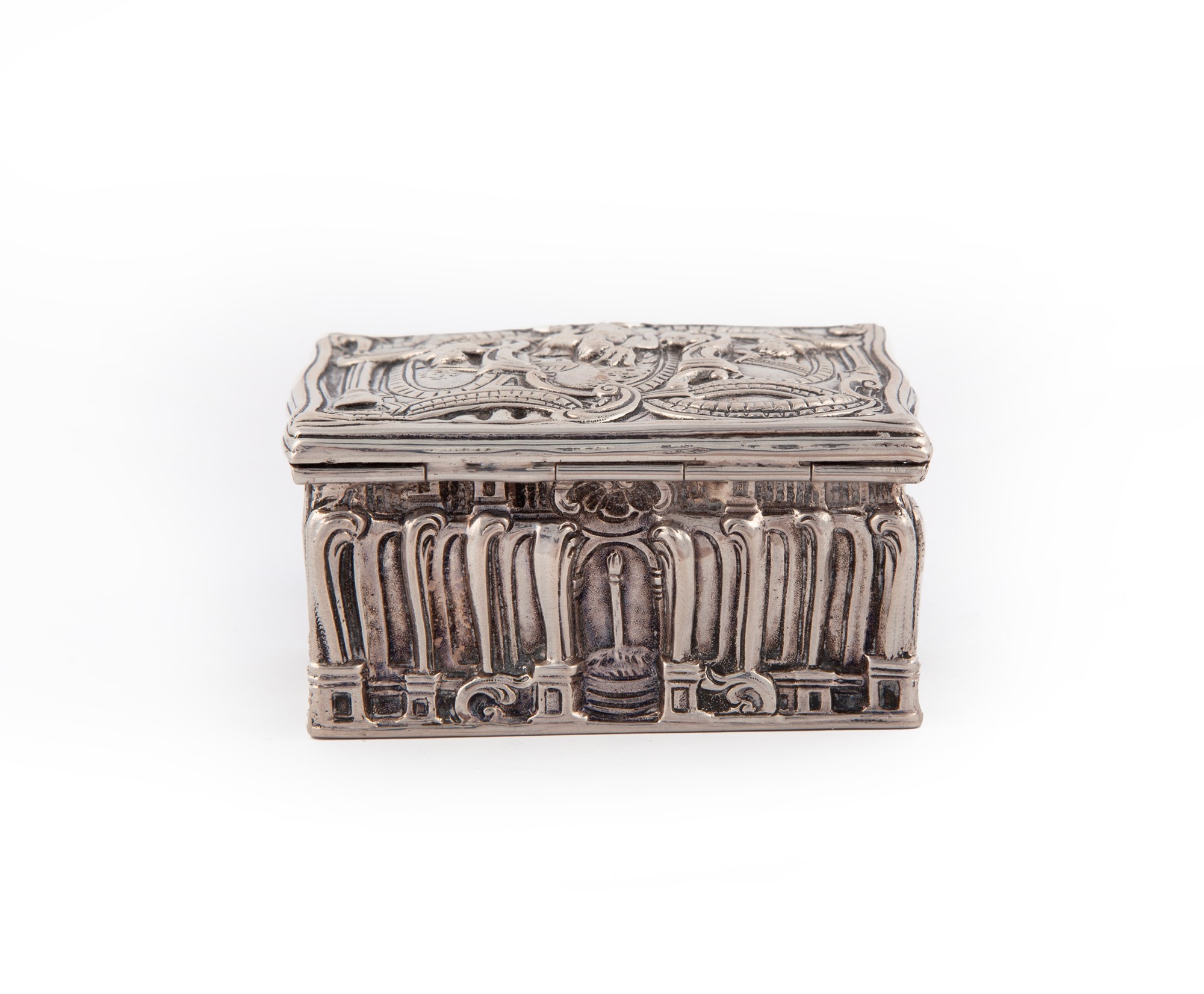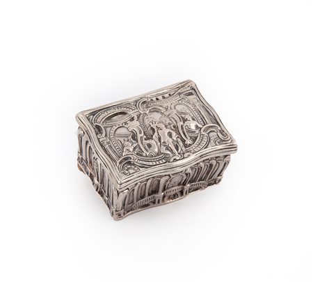 Tabacchiera rettangolare in argento 800, Germania con coperchio incernierato decorato a sbalzo da una divinità fluviale su sfondo architettonico entro cartigli; fascia percorsa da baccelli a simulare un'arcata, cm 3,8x7x5,5 - gr. 124