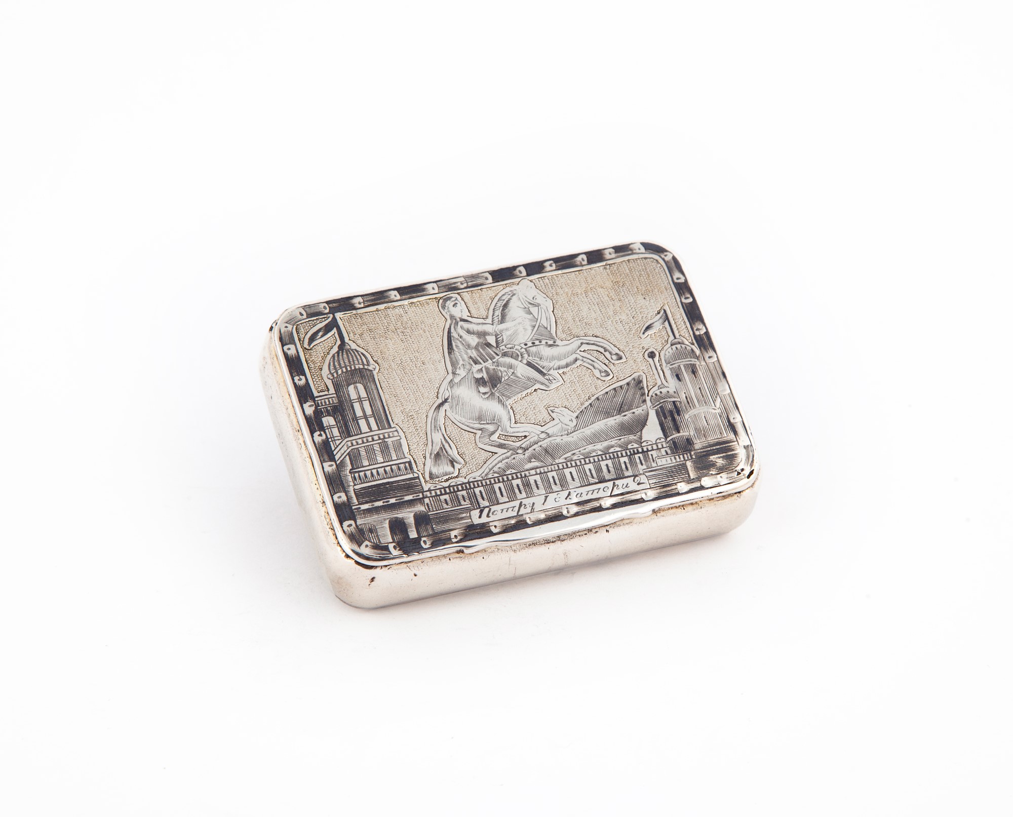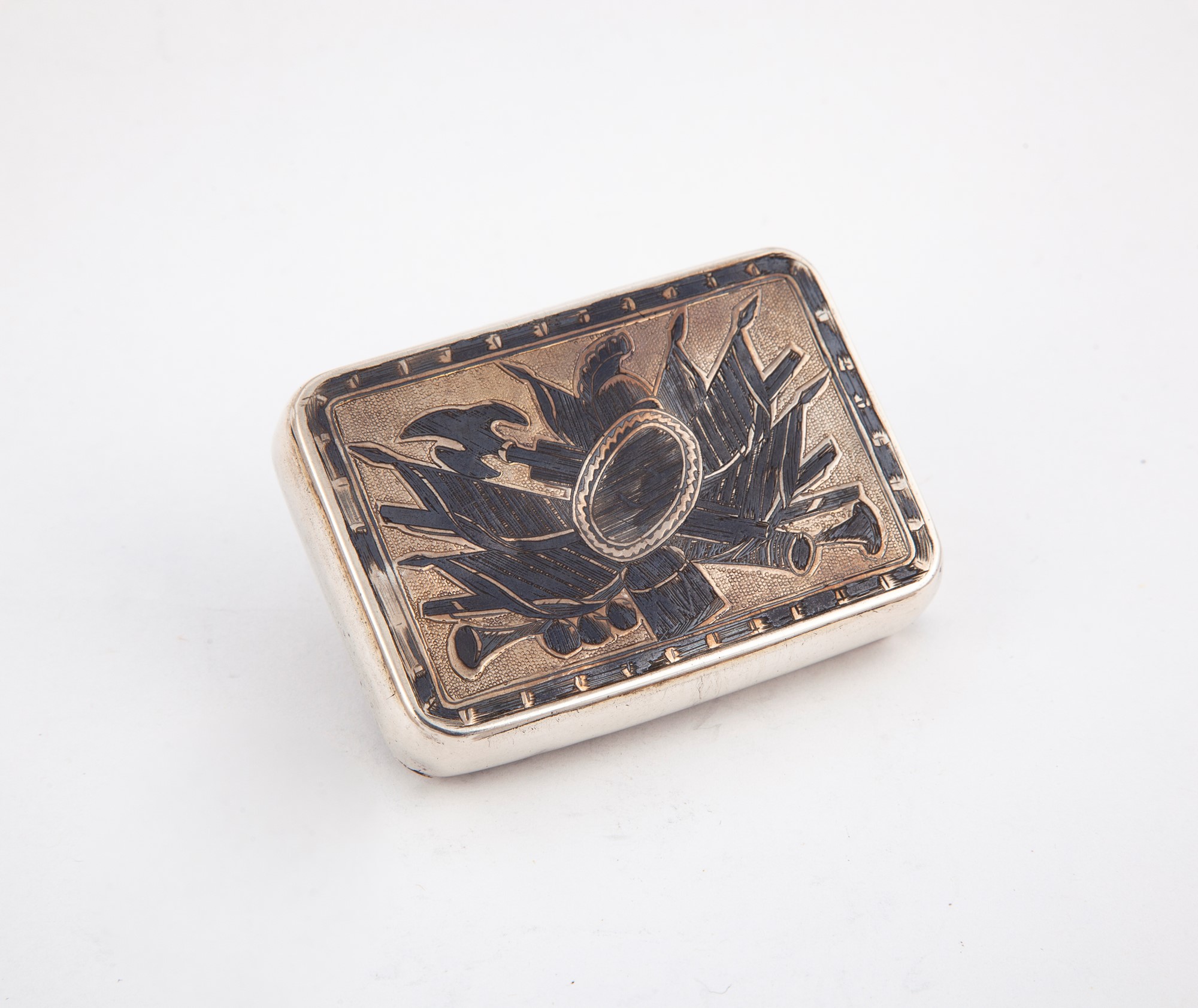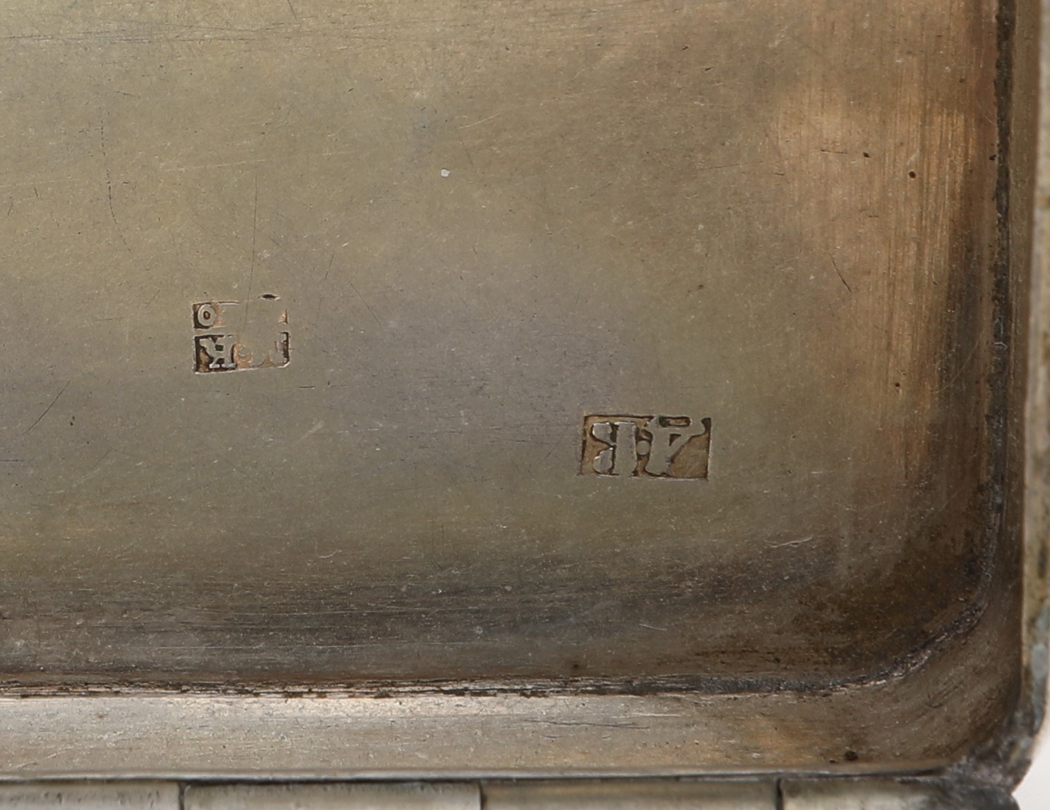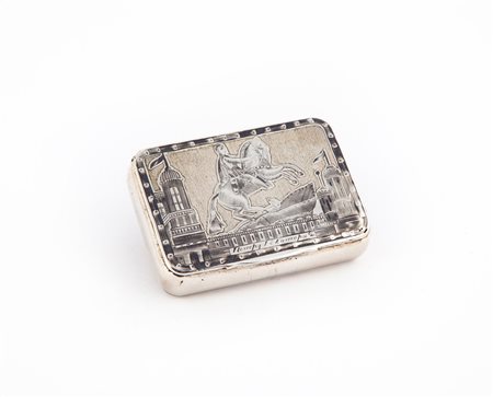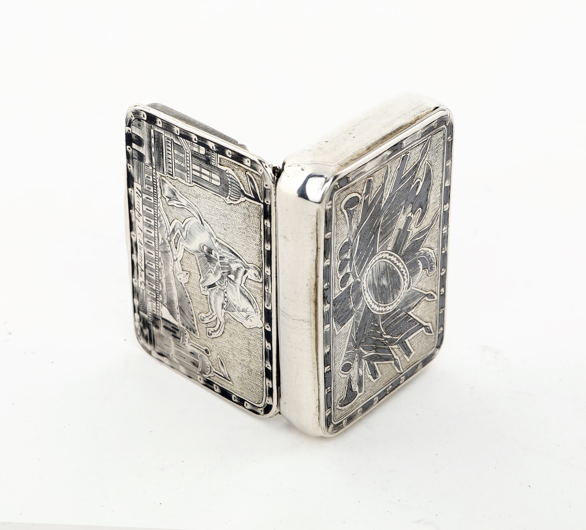 Portasigarette in argento niellato, Russia decorato sul coperchio da raffigurazione di monumento equestre e sul fondo trofeo di armi e strumenti musicali, 1,5x7x5 - gr. 60