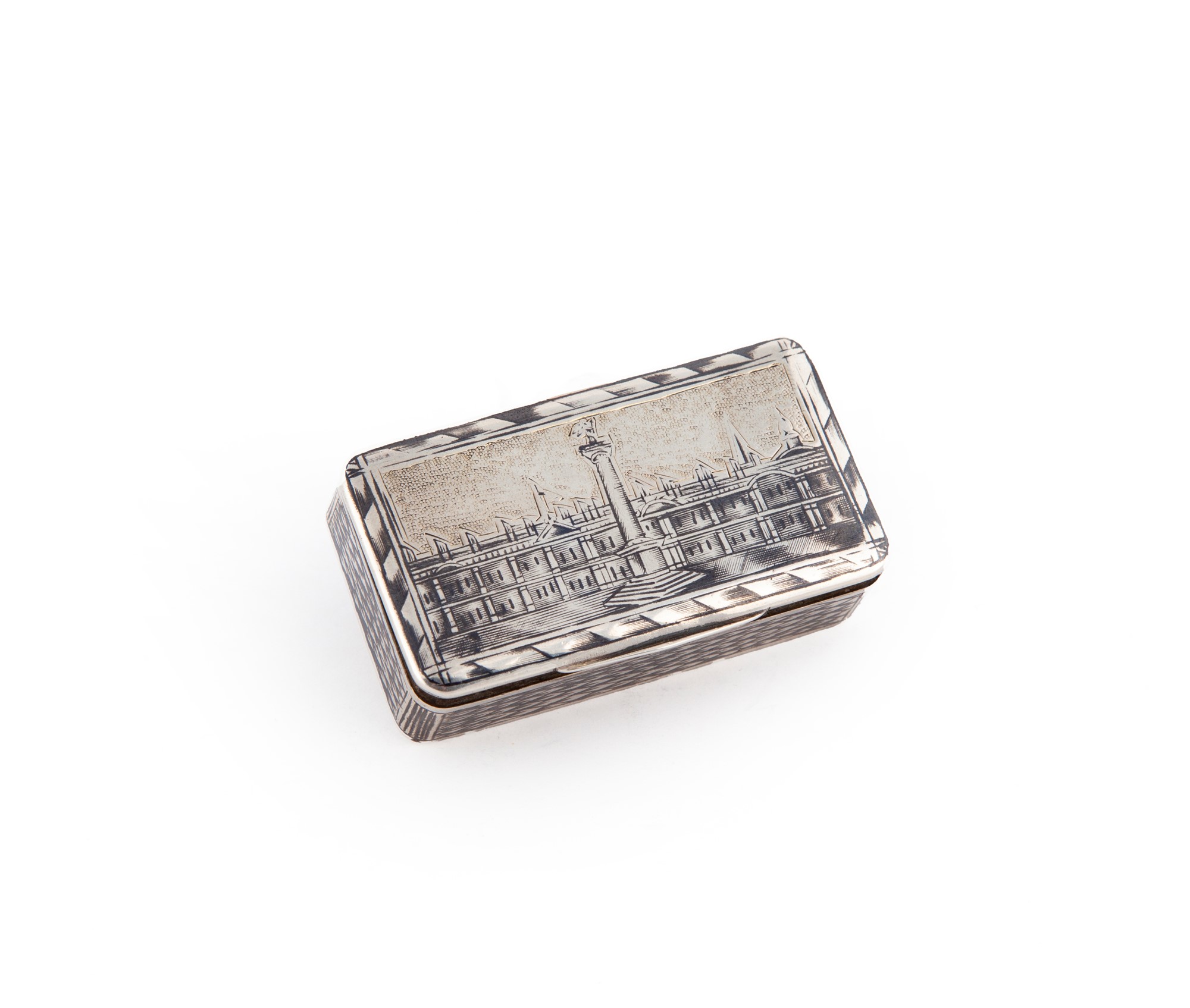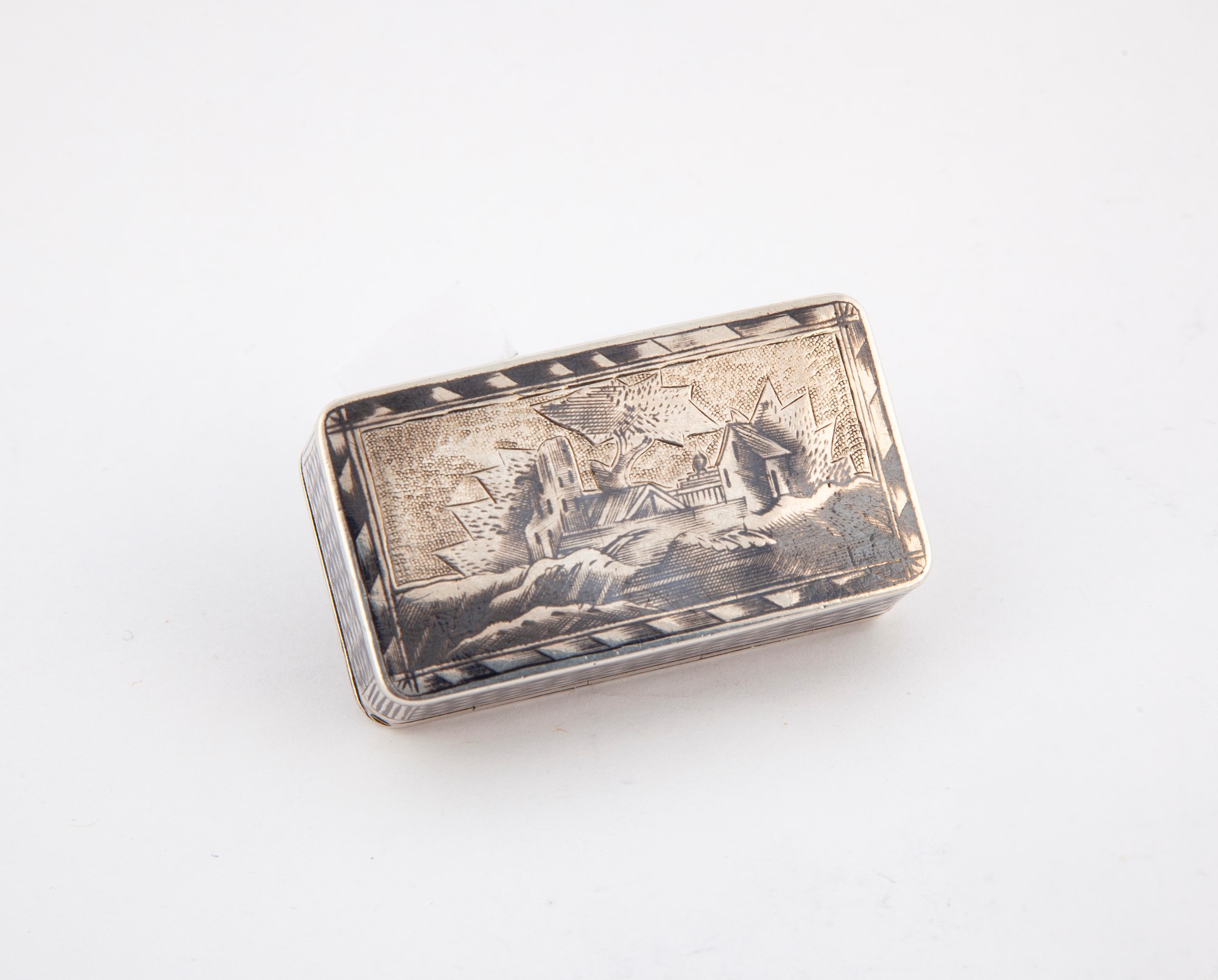 Tabacchiera rettangolare in argento 875/1000 niellato, Mosca 1841, argentiere non identificato caratterizzata sul coperchio da veduta di piazza e da un paesaggio sul fondo; fianchi con fitta decorazione geometrica, cm 1x5,5x3 - gr. 46