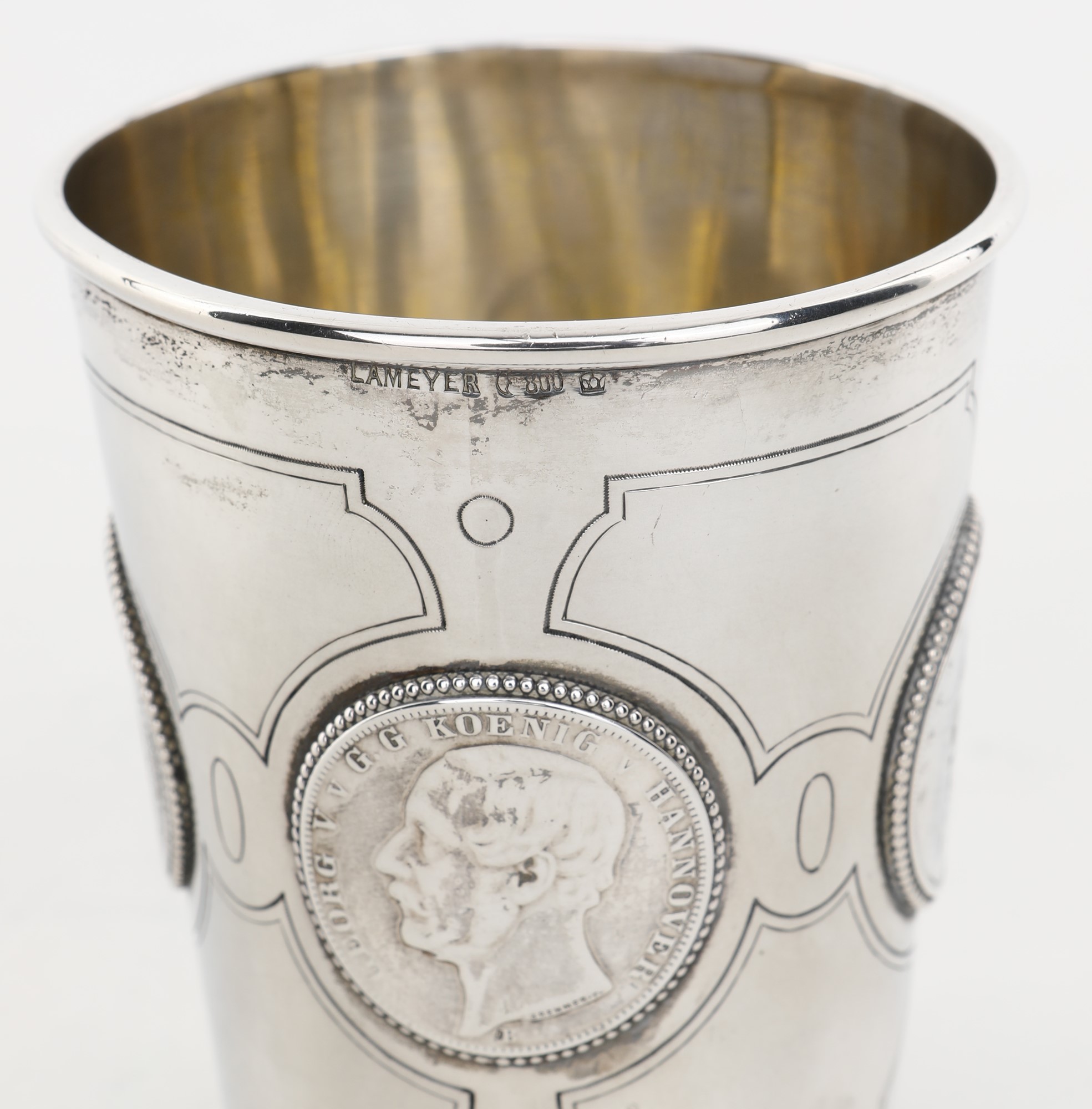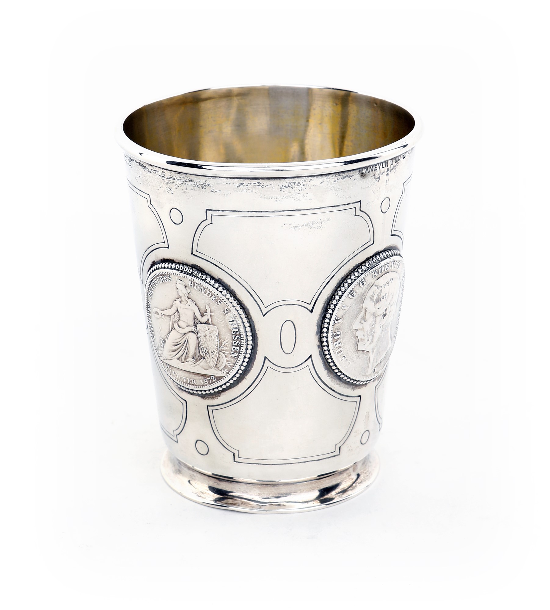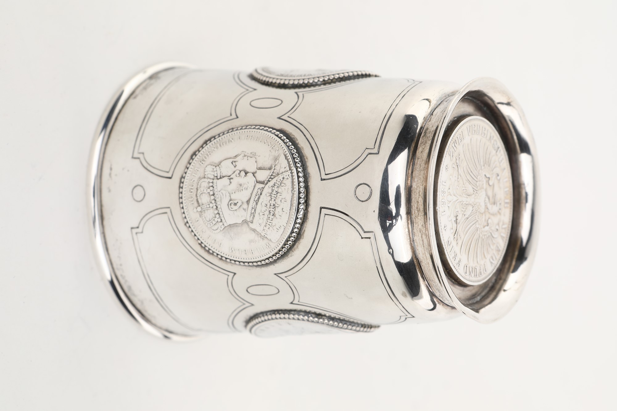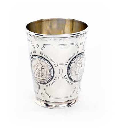 Bicchiere in argento, Germania XIX secolo, argentiere Lameyer caratterizzato da tallero tedesco datato 1861 nel piede e da quattro monete lungo la circonferenza, cm 9,5x7,5 - gr. 232