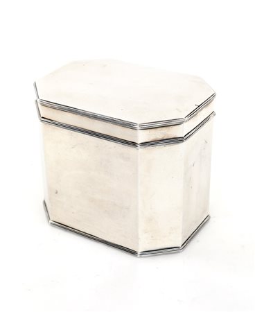Scatola porta tè in argento sterling, Massoni, Roma di forma esagonale con coperchio incernierato e superficie liscia, definita unicamente da tre ordini di sottili nervature poste a rifinire il coperchio e la base, cm 12x14,5x10,5 - gr. 650