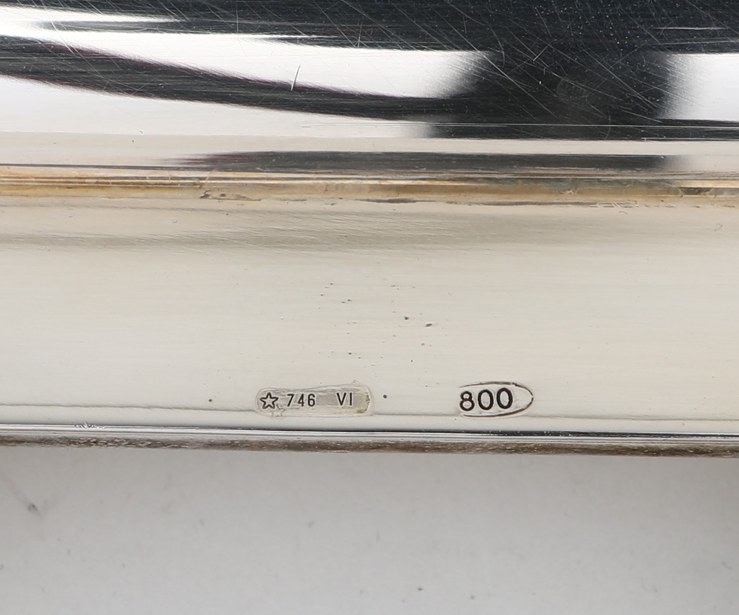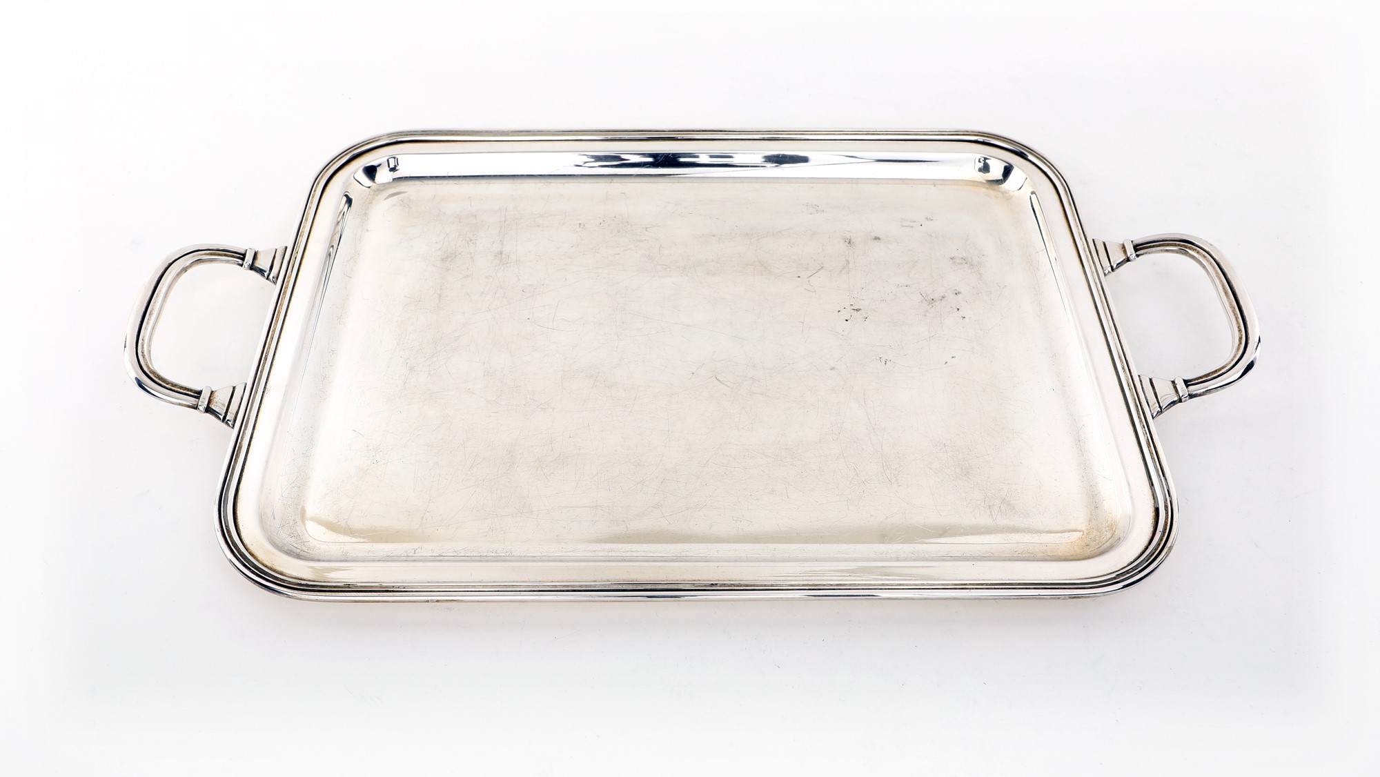 Vassoio in argento con manici di forma con angoli arrotondati e ciglio modanato, cm 38x22 - gr. 560