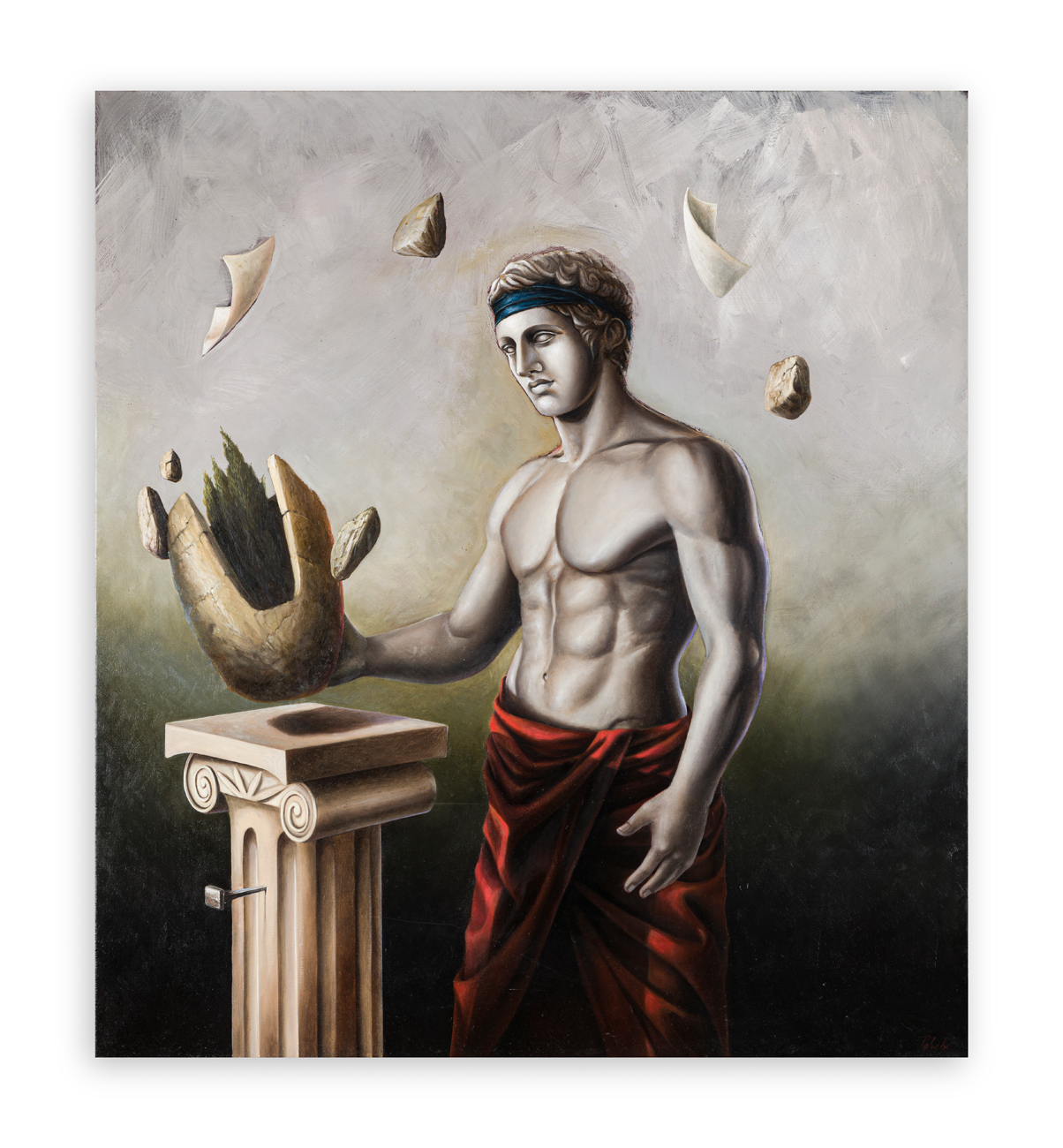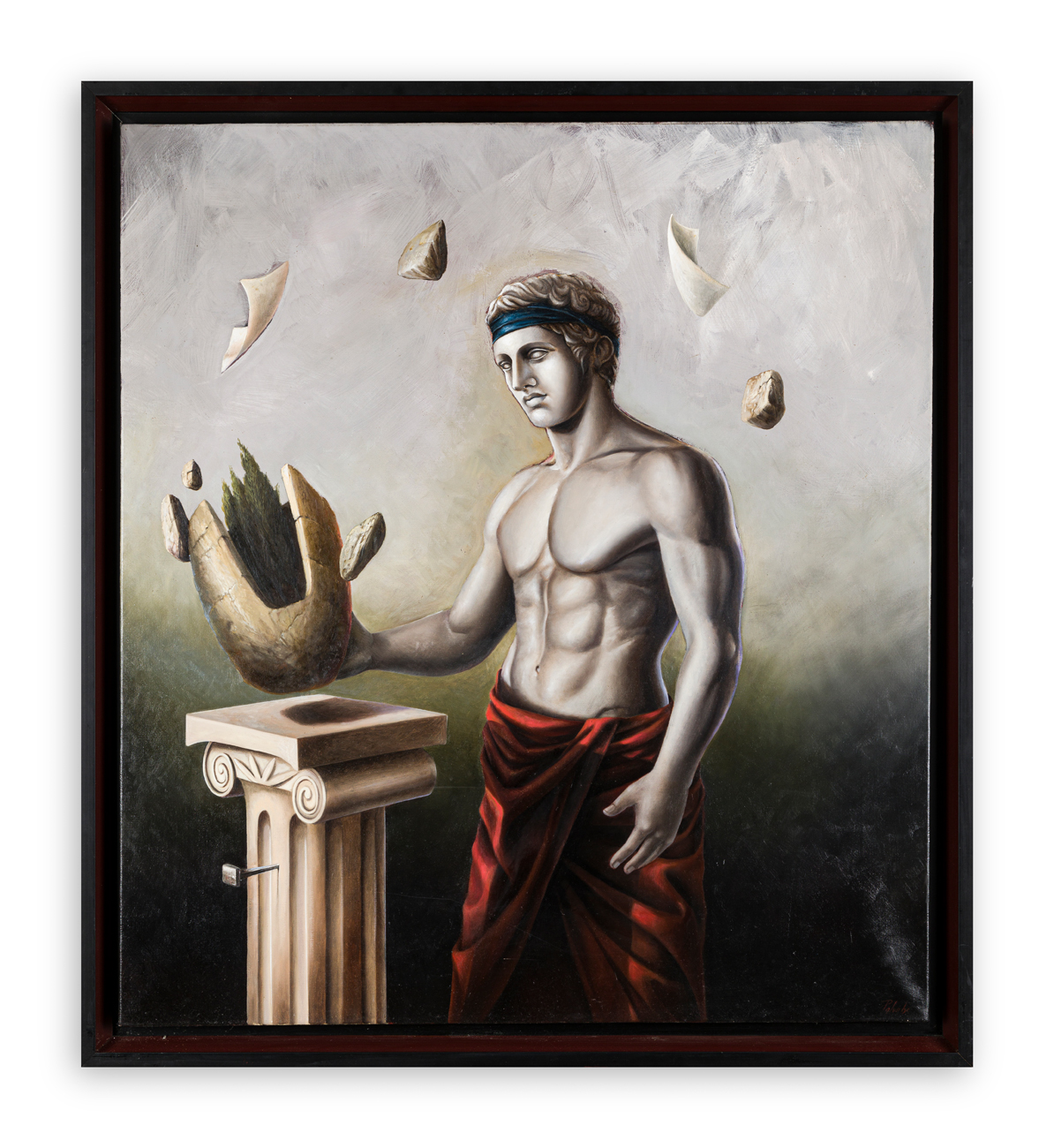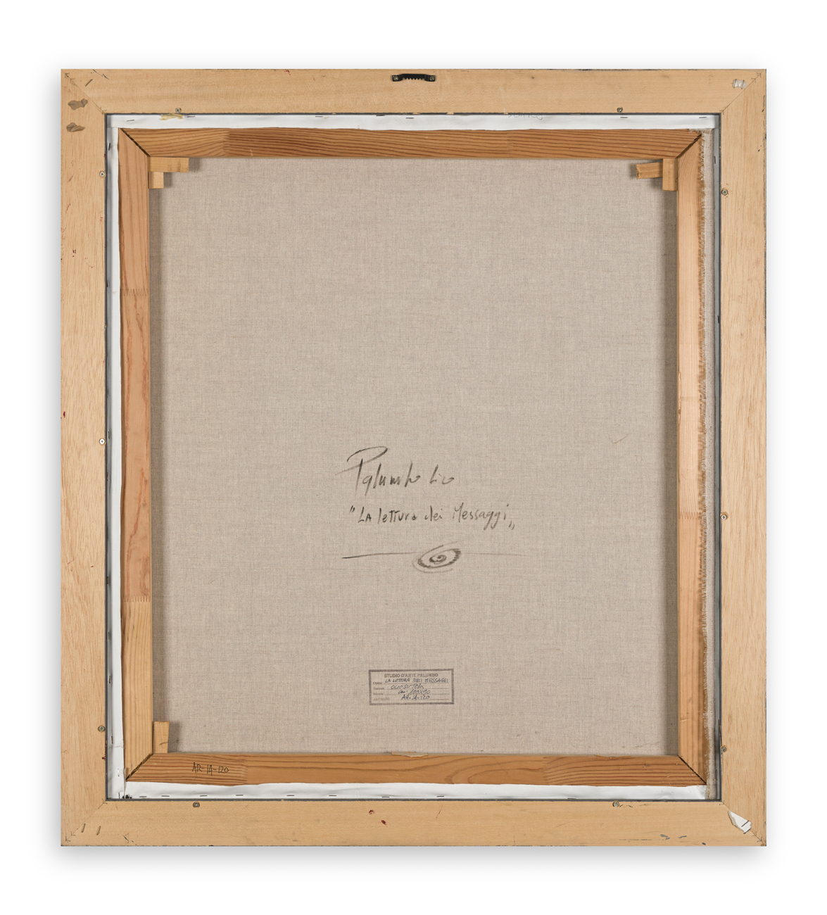 Firma, titolo e timbro dello Studio d'Arte Palumbo recante titolo, tecnica, misure e numero di archiviazione al retro