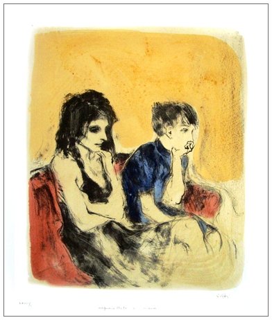 ALBERTO SUGHI Cesena 1928 - Bologna 2012 Senza titolo (Le due amiche) Litografia acquerellata a mano es.LXVII/C. Firma in b. a d., tecnica in b. al c. (60 x 45 foglio – 34 x 28,5 lito.) Certificato di autenticità e provenienza Telemarket, Roncadelle.