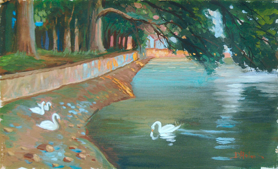 DINO HELMS Laghetto con cigni Olio su cartone cm. 15x25 firmato