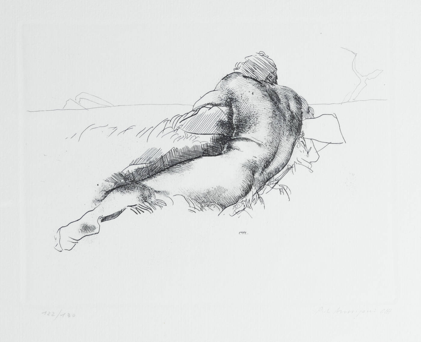Opera con sigla in lastra non decifrata; firmata in basso a destra anche con sigla non decifrata, numerata in basso a sinistra (a matita sul foglio)