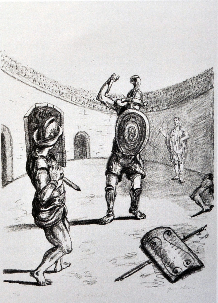 GIORGIO DE CHIRICO Gladiatori nell’arena, 1969 Litografia – es. 10/90 cm....