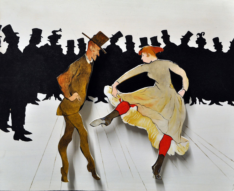 BOTTEGA RANFAGNI Omaggio a Toulouse Lautrec, 1995 Figure in legno sagomate dipinte a olio applicate in rilievo su cartone telato dipinto a olio cm. 48x57,5x3 firmato e datato