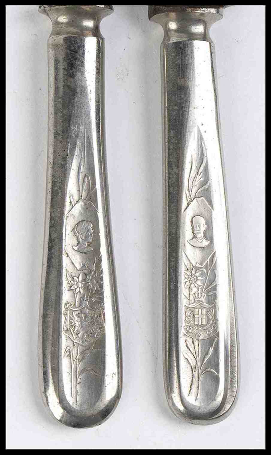 Lotto di posate da arrosto decorate con ritratti di Vittorio Emanuele II e Elena