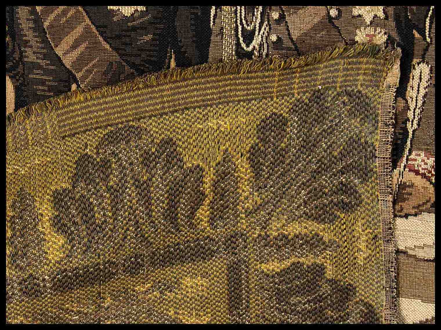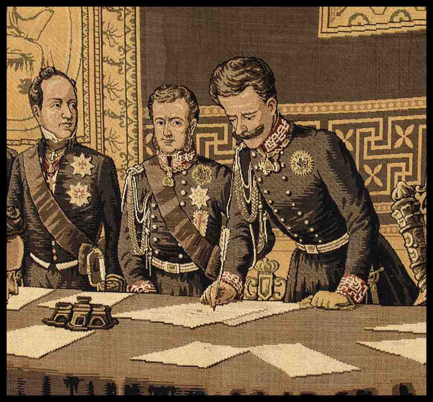 grande e importante arazzo raffigurante il re in atto di firmare il documento, copia in serie. Un altro esemplare si trova al Museo di Risorgimento di Torino.
