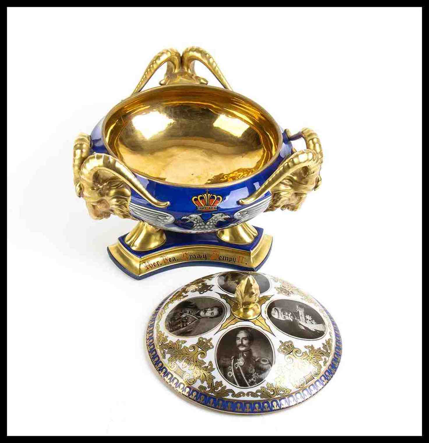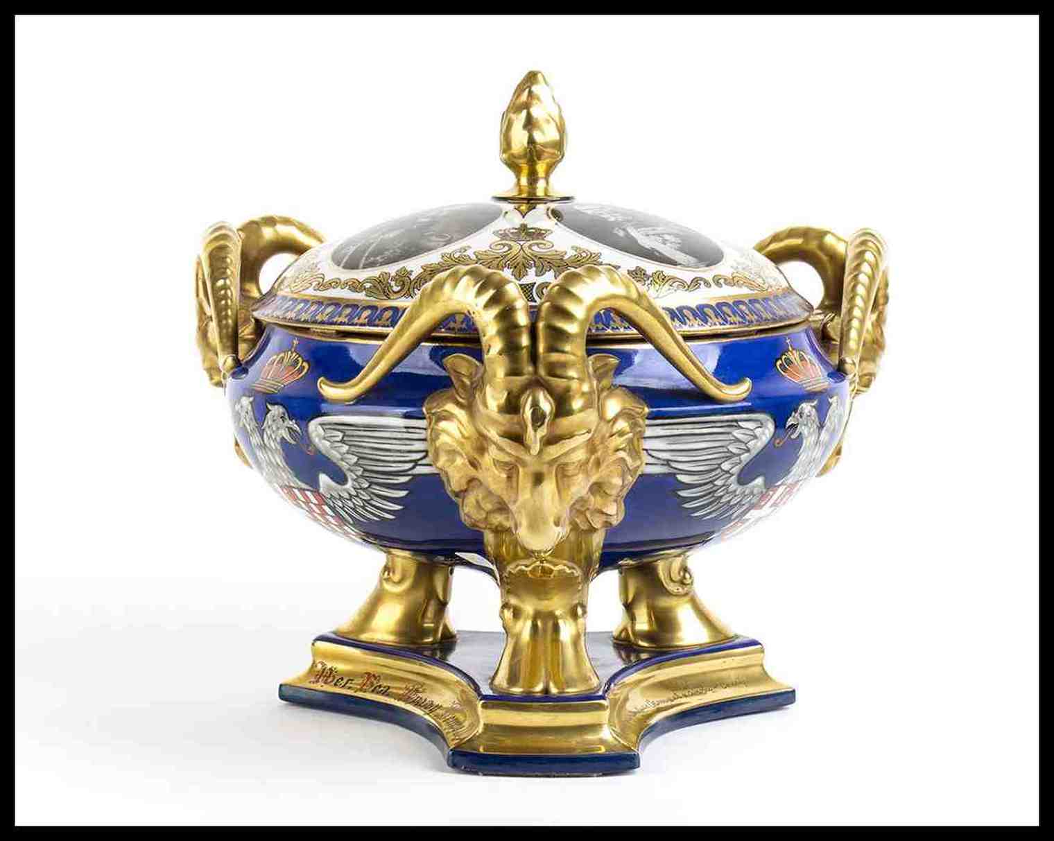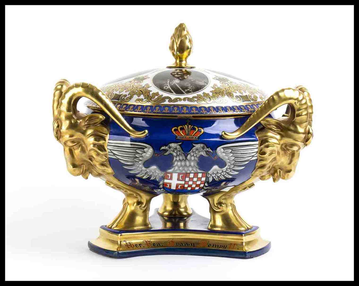 importante bella zuppiera in porcellana decorata di teste di ariete in oro ed aquila araldica del Regno di Yugoslavia in smalti policromi, sul coperchio sono ritratti in monocromia gli ex regnanti degli stati che fondendosi hanno creato il Regno di Yugoslavia, sulla base in corsivo il nome dell’artefice, Milan Stanishich e figli, Sambor e la dedica a Sua Maesta’ Pietro II in caratteri gotici cirillici, in ottimo stato, 35 x 40 x 40 cm