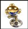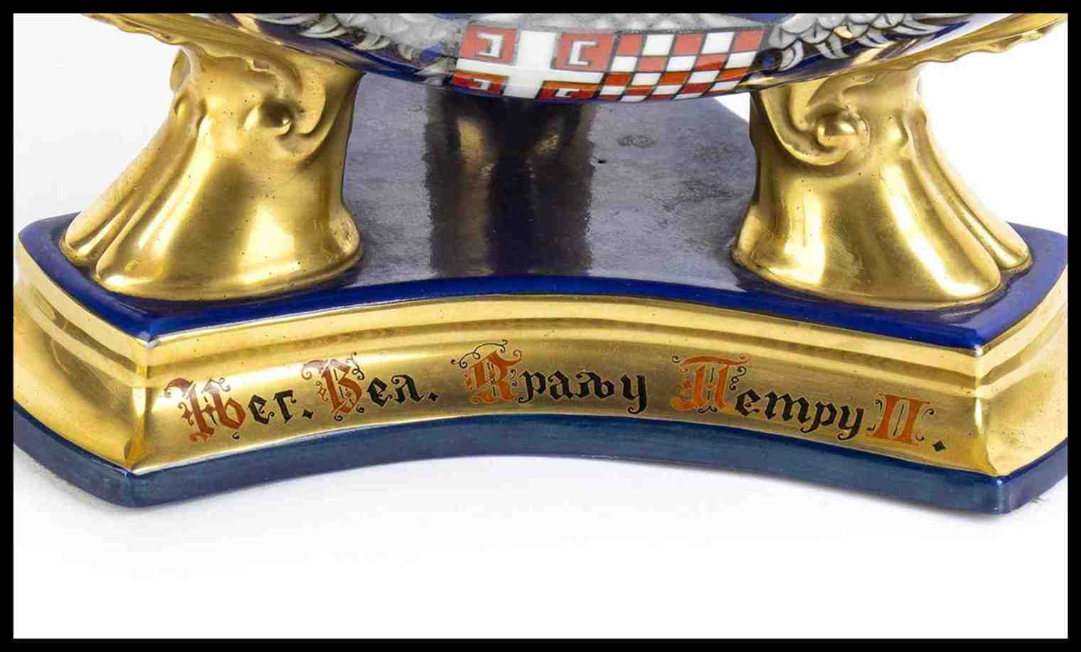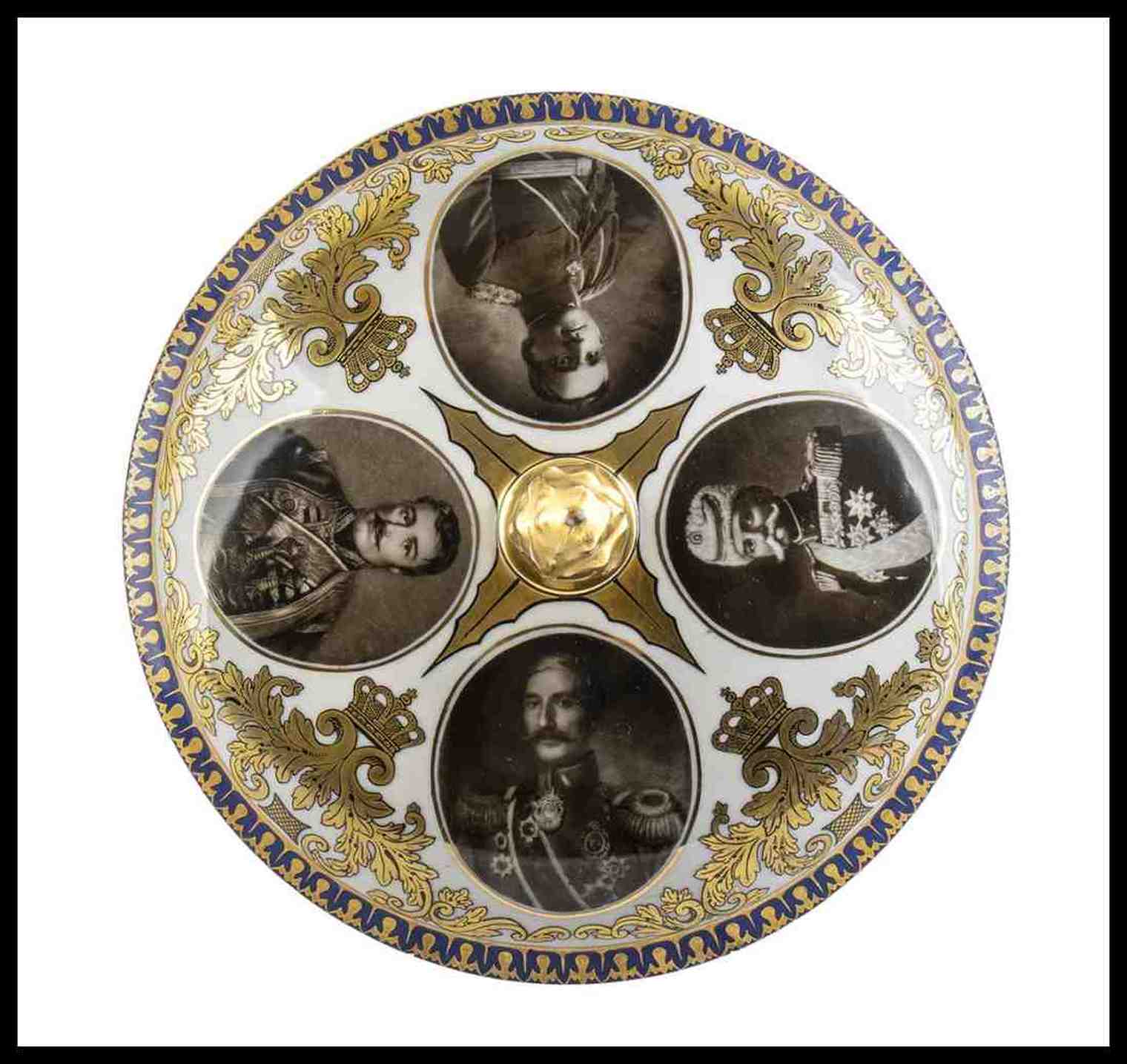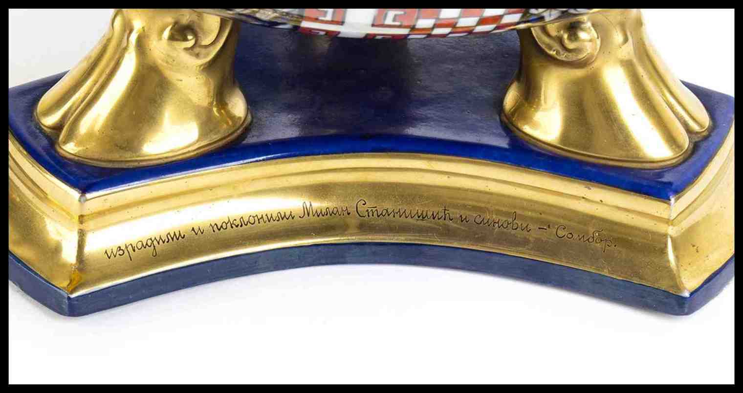 importante bella zuppiera in porcellana decorata di teste di ariete in oro ed aquila araldica del Regno di Yugoslavia in smalti policromi, sul coperchio sono ritratti in monocromia gli ex regnanti degli stati che fondendosi hanno creato il Regno di Yugoslavia, sulla base in corsivo il nome dell’artefice, Milan Stanishich e figli, Sambor e la dedica a Sua Maesta’ Pietro II in caratteri gotici cirillici, in ottimo stato, 35 x 40 x 40 cm