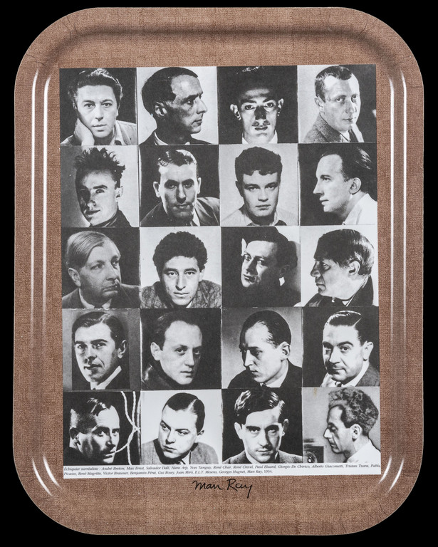 screenprinted tray with images of the Surrealist artists of 1934 18 89x14 56 in