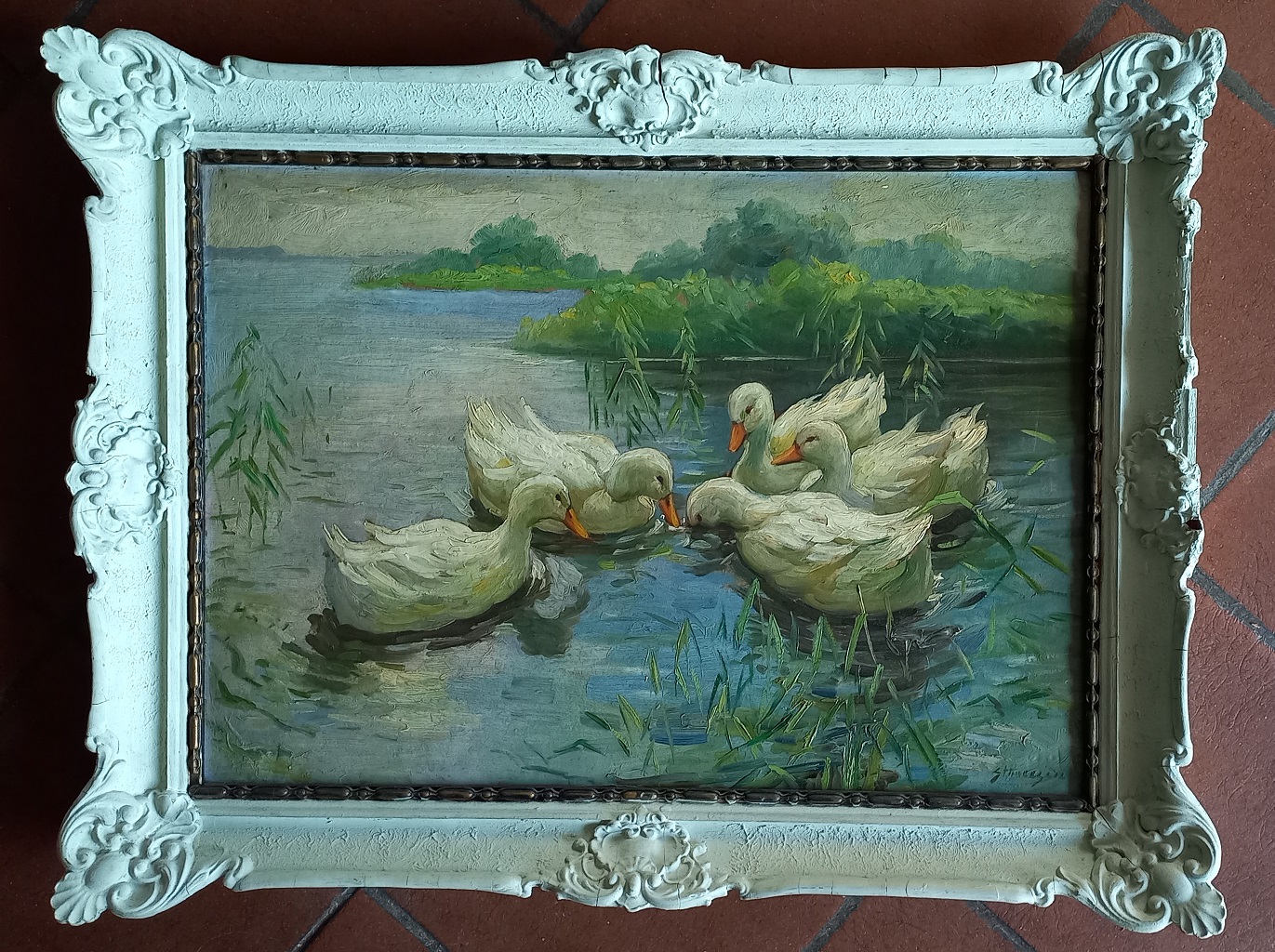 Firma indecifrata Anatre nello stagno olio su cartone cm.50x70 firmato in...