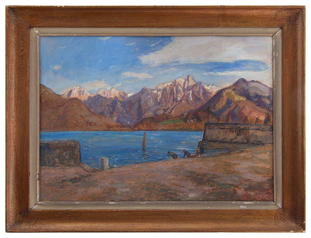 Luigi Zago Villafranca (VR) 1894 - Mendoza 1952 Veduta lacustre Olio su cartone cm 47,5x68
