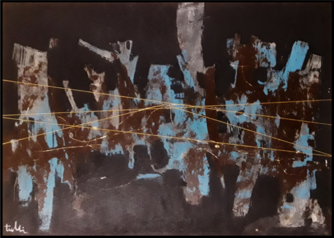 TULLI WLADIMIRO Macerata 1922 - 2003 "Bruno viaggia in nero, oro non sempre" Acrilico e collage su tavola cm 70x50 del 1963. Firmato sul fronte in basso a sinistra. Sul retro firma, data ed etichetta del 3° Premio Scipione Nazionale di pittura (Macerata 1965). Autentica su foto.