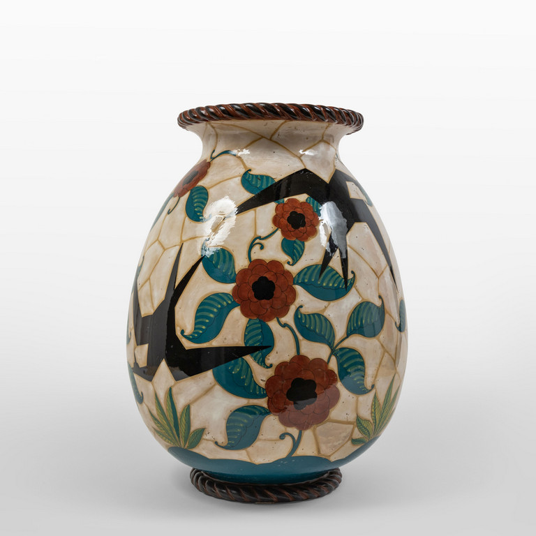 Un grande vaso in maiolica con decoro di uccelli fantastici su fondo vegetale.