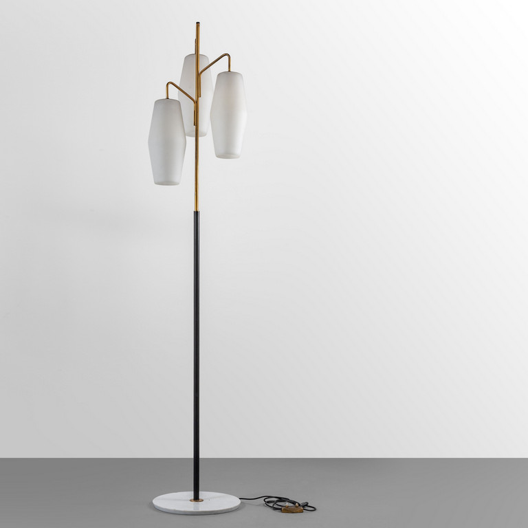 Marmo acciaio tubolare verniciato ottone vetro 'Triplex Opal' satinato.