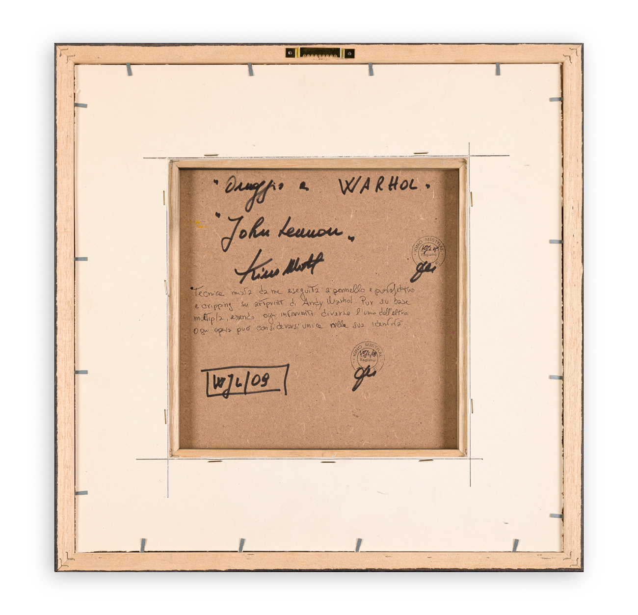 Firma, titolo, tecnica, numero di registrazione e timbri dell'Artista al retro