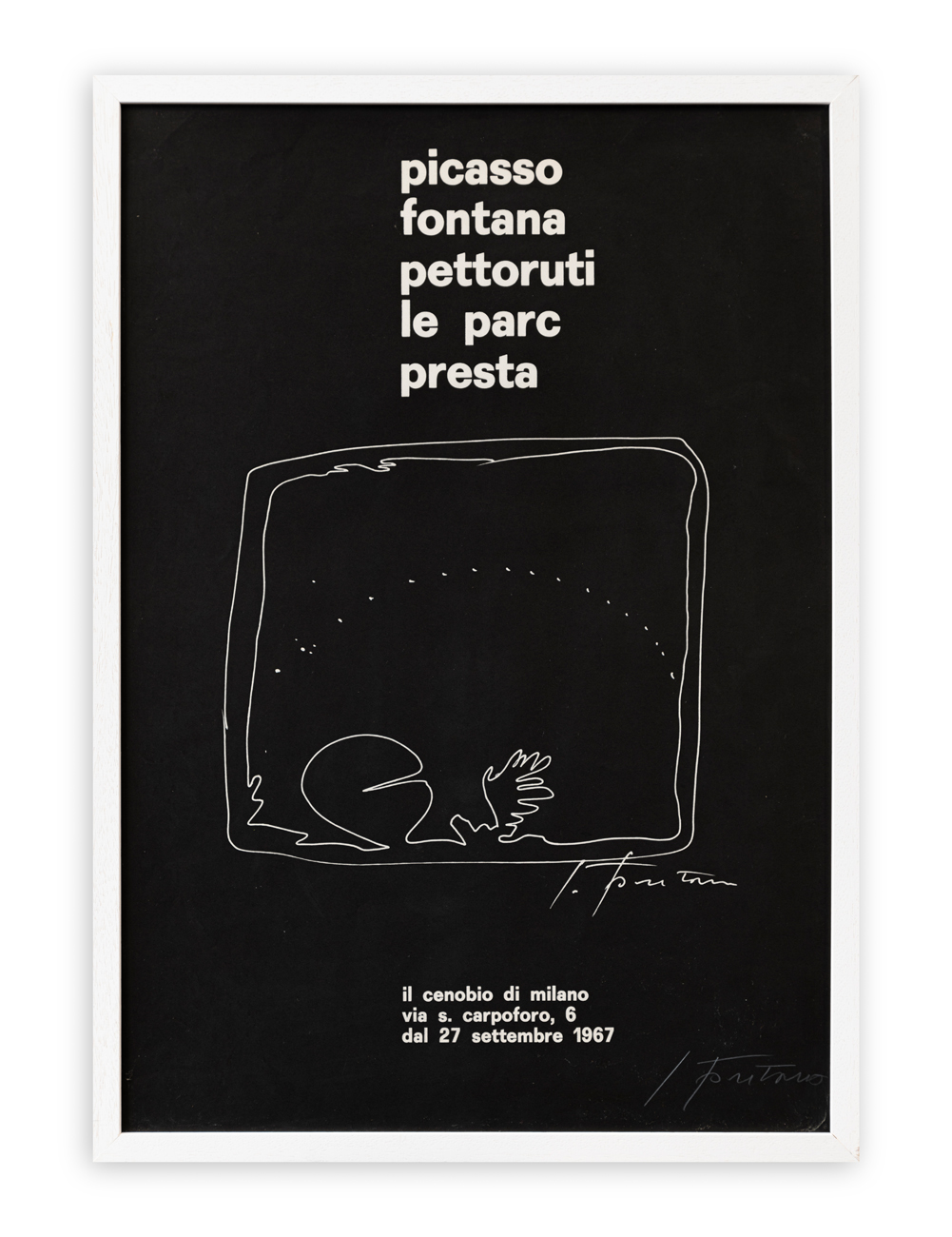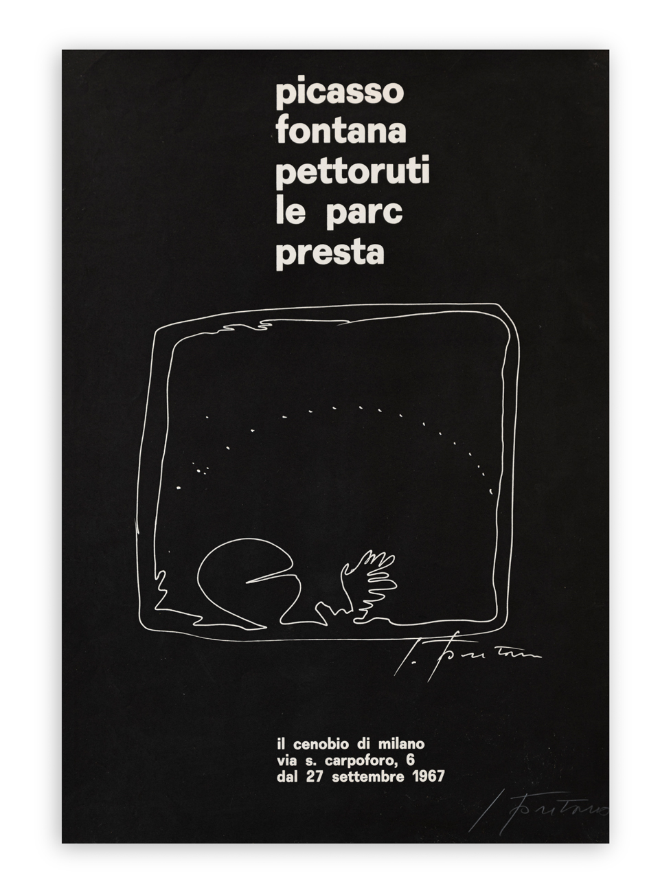 Locandina dell'esposizione 'Picasso - Fontana - Pettoruti - Le Parc - Presta' tenutasi presso Cenobio, Milano, 1967