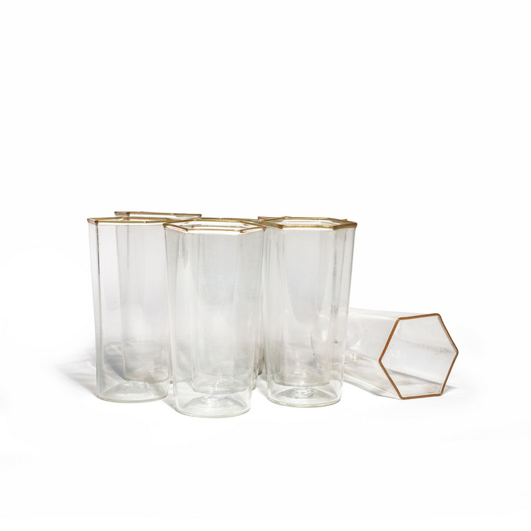 Otto bicchieri esagonali in vetro trasparente con bordo di avventurina.