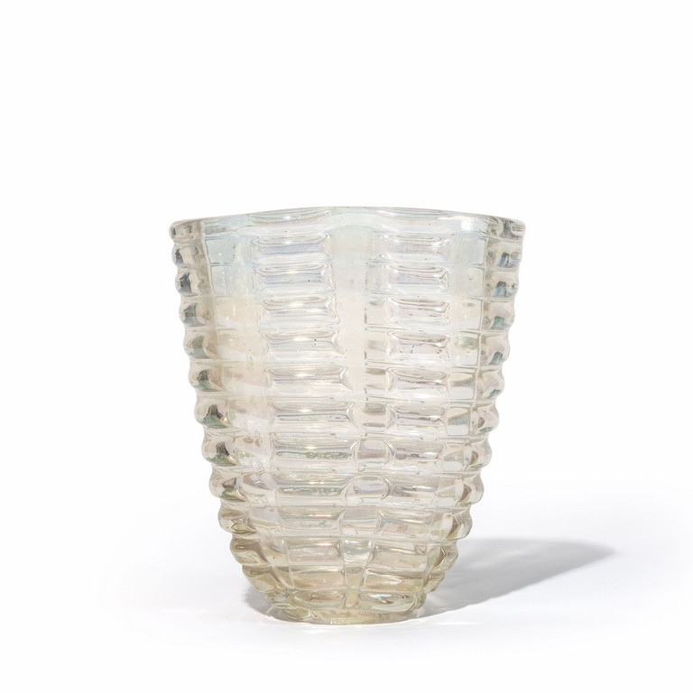 Un vaso 'bugnato' a sezione ellittica in cristallo iridato e decoro di rilievi regolari.
