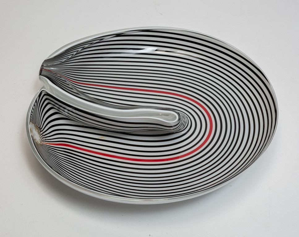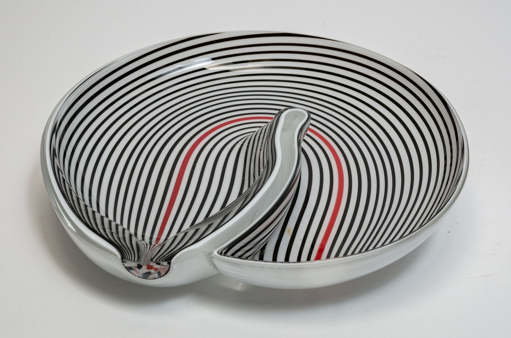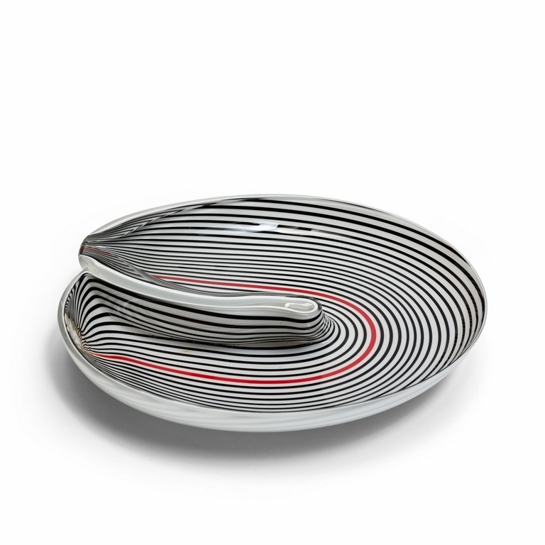Un piatto a canne vitree nere con inserita una canna vitrea rossa e fondo lattimo.