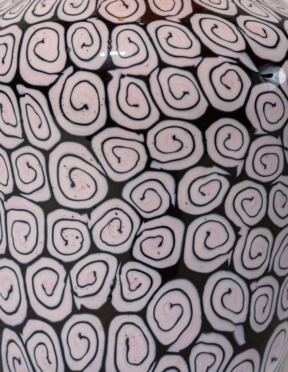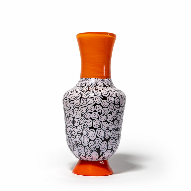 A vase with a body of spiral murrine and a base and neck in orange glass